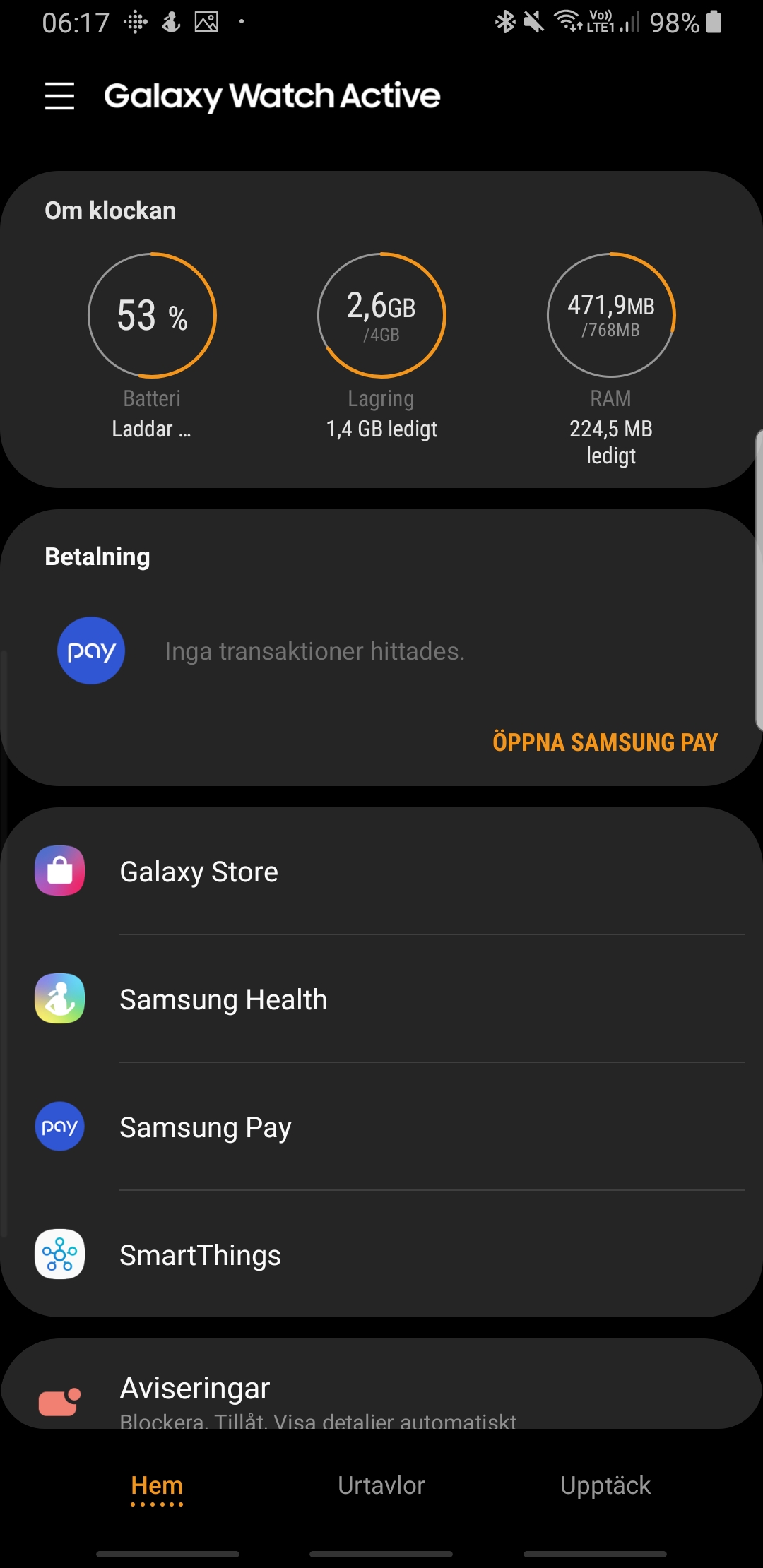 På tal om applikationer finns det inte så värst många att ta del av jämfört med till Wear OS och Watch OS från Google respektive Apple. Det är också lite konstigt att en smartklocka varken har tidtagare eller stoppklocka förinstallerat.