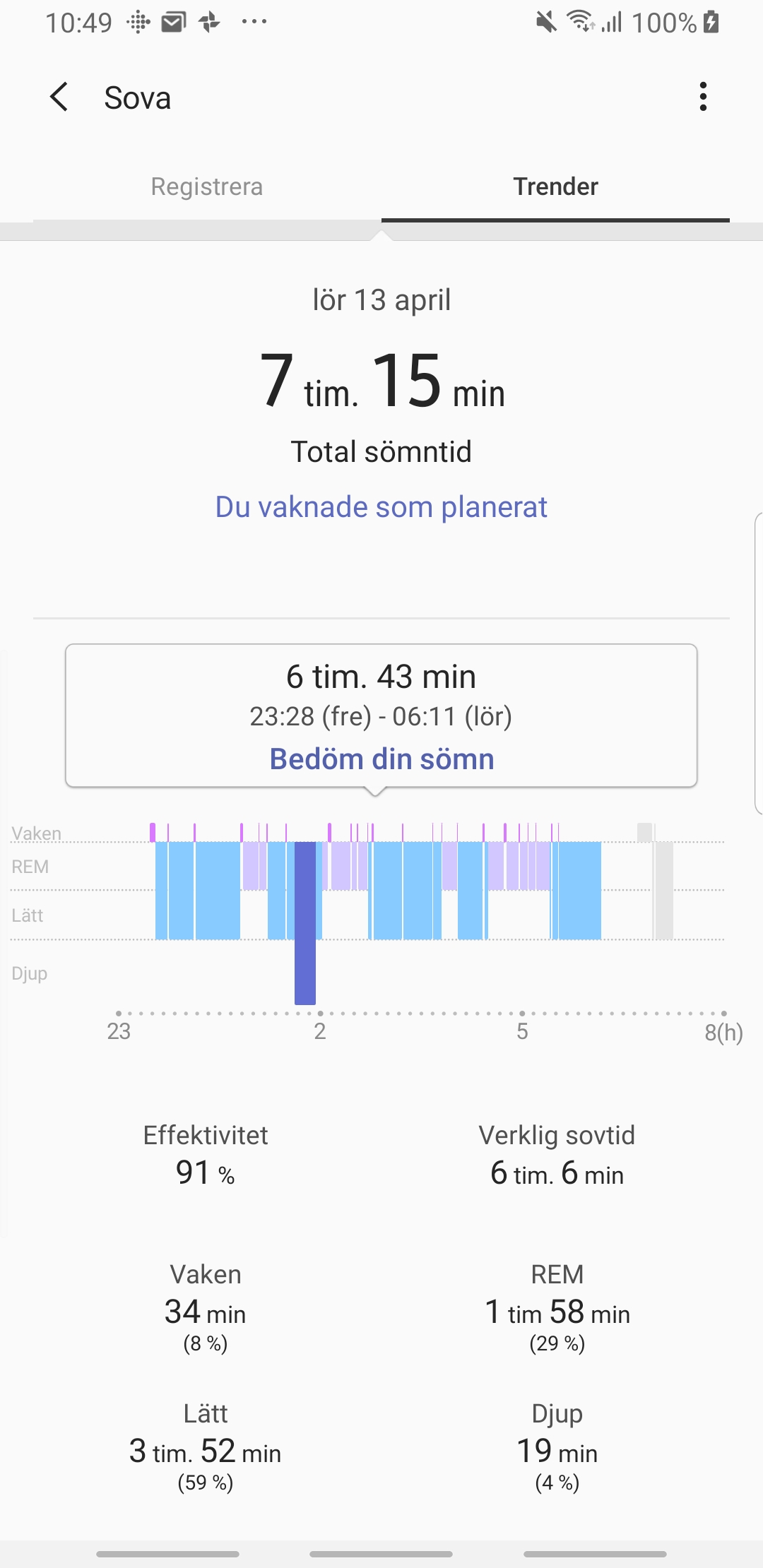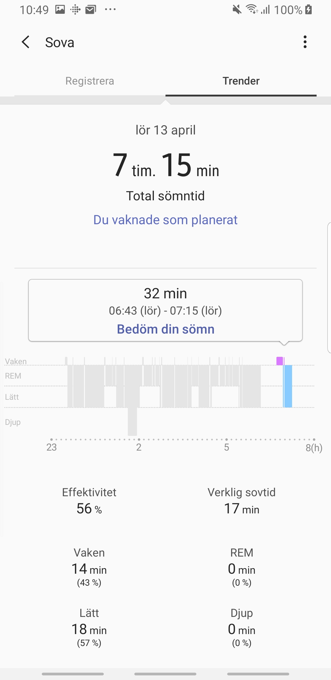 Galaxy Watch Active mäter också sömnkvalitet men här är det också svårare att bevisa korrekthet. Klockan mäter de olika sömnstadierna (lätt-, djup-, och REM-sömn) samt hur mycket användaren var vaken. Den visar också en beräknad sömneffektivitet som motsvarar tiden användaren låg i sängen och faktiskt sov.