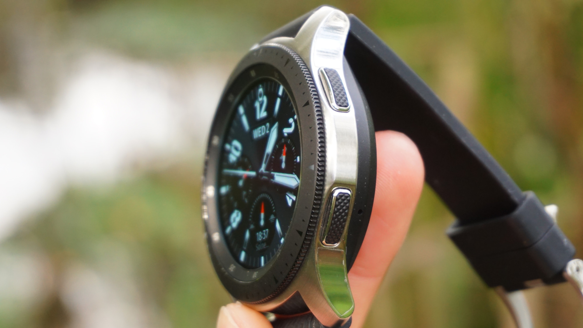 Vår testmodell är den större 46 millimeters-modellen med en glansig stålyta. Samsung Galaxy Watch kommer också i färgerna svart och roséguld men dessa är snäppet mindre på 42 millimeter, alltså 45,7 x 41,9 centimeter tvärs över. Utöver små skillnader på skärm- och kroppsstorlek är batterierna nästan hälften så stora i de mindre modellerna. Det medföljande armbandet är av gummi och har en robust design. Detta passar bra om klockan ska användas till träningsaktiviteter. Samsung har använt sig av 22 millimetersstandarden för armbandsfästen vilket betyder att de är lätta att byta ut hos en vanlig klockhandlare, något som vi uppskattar. Med sitt runda utförande har Galaxy Watch lätt att imitera ett klassiskt tidtagarur. Jämfört med Apple Watch 4, som är mer rektangulär, innebär det dock vissa kompromisser för vad som kan rymmas på skärmen samtidigt.