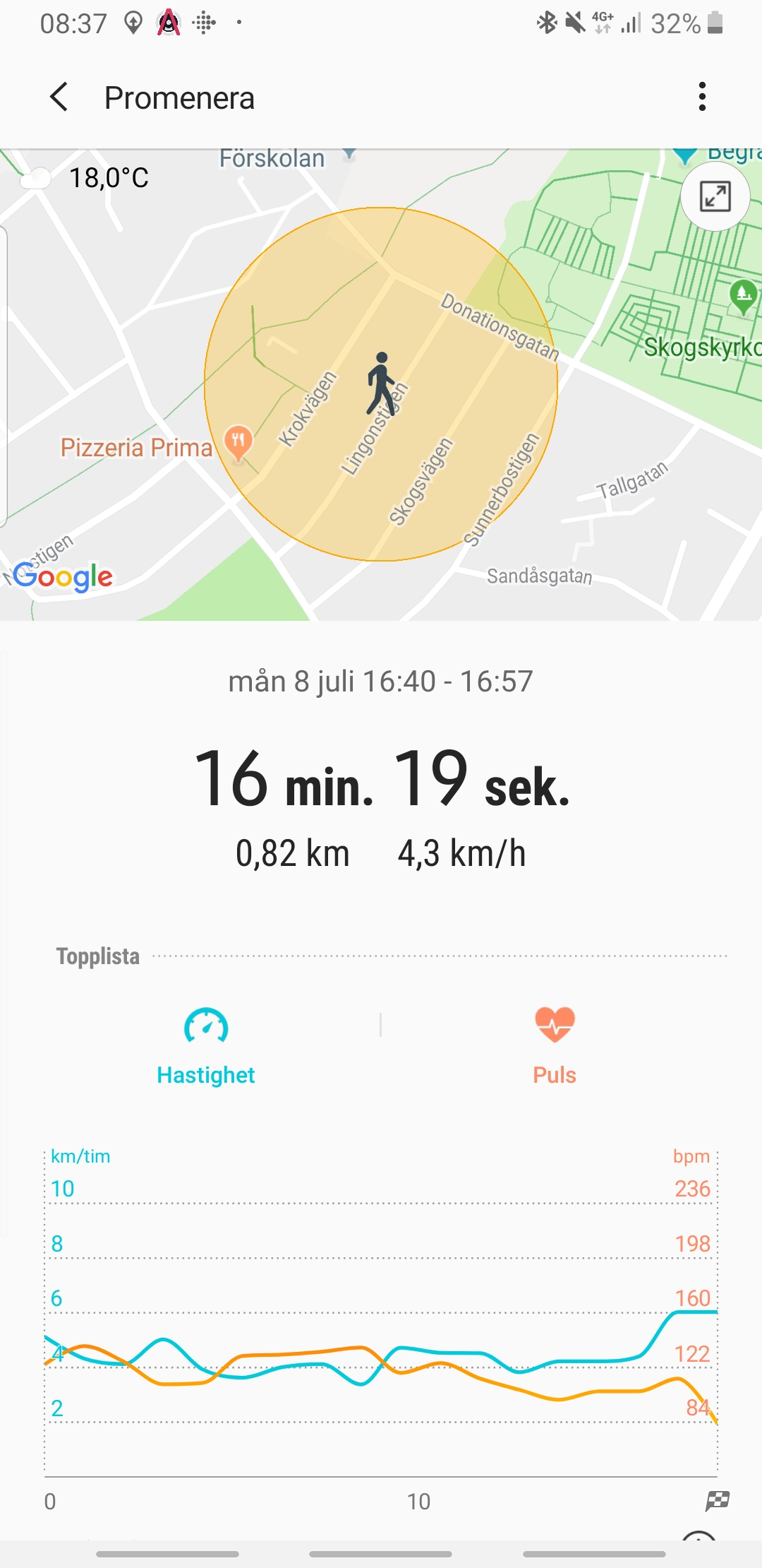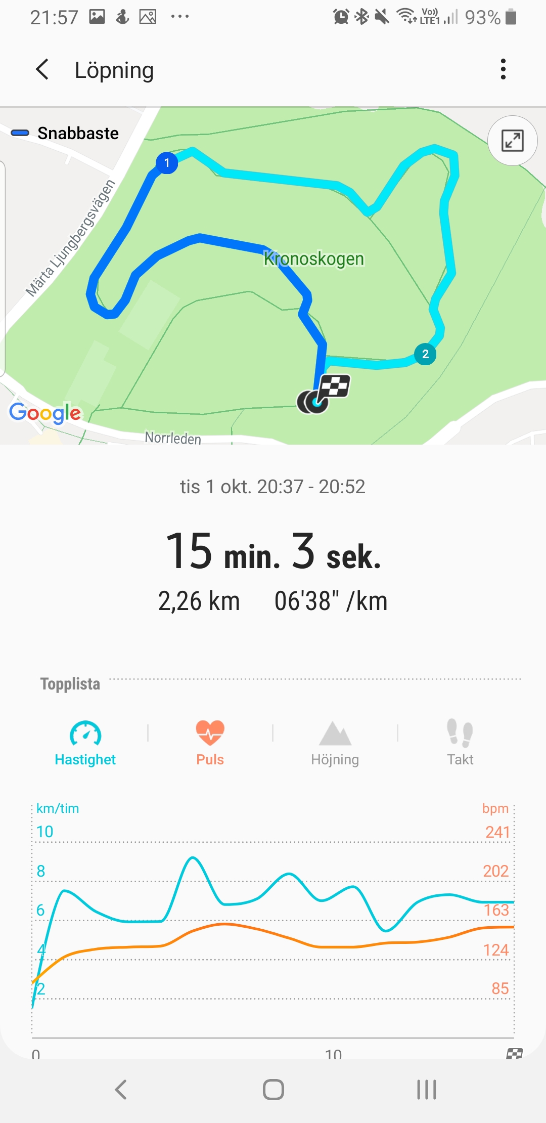 För konditionsbaserad träning utomhus används GPS för att kartlägga rutt, avstånd och hastighet. Vi testar detta i skogsmiljö då det är där och bland höghus som GPS-signaler behöver jobba lite extra. Under testet mäter klockan 2,26 av 2,3 kilometer. Under aktiviteter som löpning har pulsmätaren svårt att hänga med. Den tappar kontakten och ligger som regel för lågt, men även för högt, vilket ger en felaktig snitt- och maxpuls. Att mäta puls under fysisk aktivitet ger en tydligare bild av hälsa, kondition och kaloriförbränning. Galaxy Watch pulsmätare lämpar sig alltså inte för seriös träningsspårning.