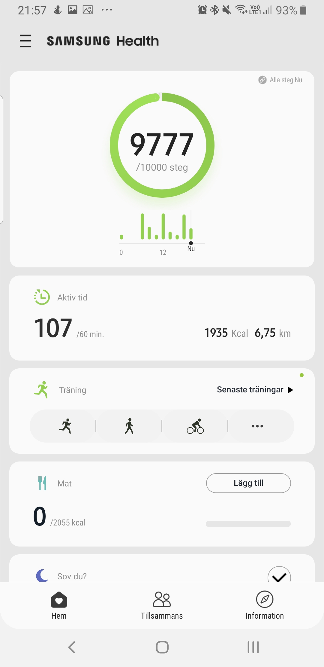 Under ett test på 500 steg ser vi att Galaxy Watch missar 6 steg. Det är i sig inte så mycket jämfört med konkurrenter, där Apple Watch 4 exempelvis räknade 3 steg för mycket. Det innebär att Galaxy Watch räknar med mer exakthet än till exempel Fitbit Versa Lite, som under samma test visade 20 steg för mycket. Samsung Health räknar samtidigt steg från både klockan och telefonen. På tidigare modeller var det möjligt att välja vilken av enheternas steg som skulle visas. Med Galaxy Watch är det inte längre ett val. Vi ser att stegräknaren på klockan uppdaterar sina steg när data synkas med telefonen. Även om klockan suttit på armen hela dagen eller direkt efter aktiviteter där telefonen har legat stilla länge. Det gör det svårt att avgöra om klockan räknar för få steg, eller om telefonen lägger till extra steg som råkar komma med i resultatet.