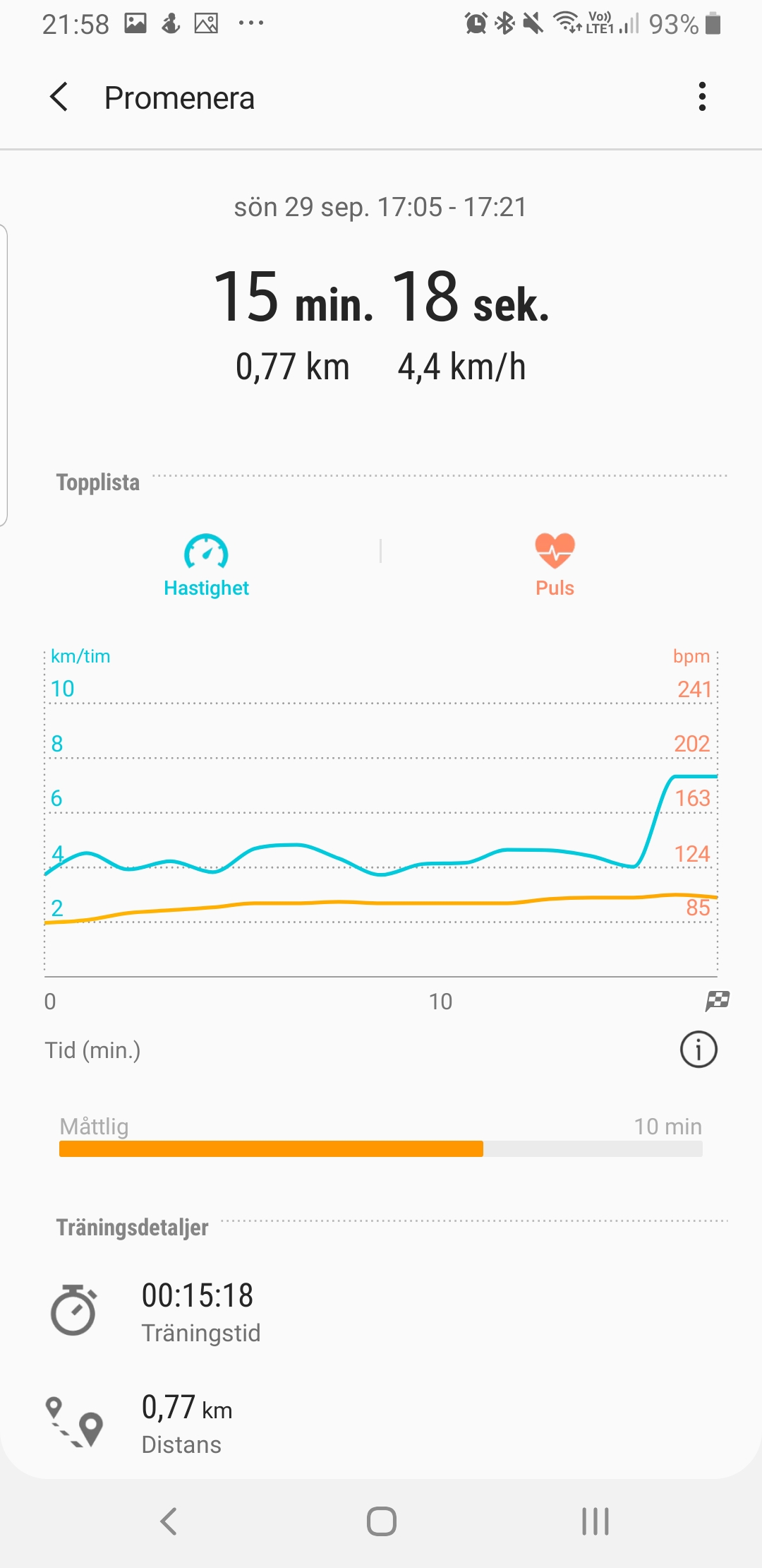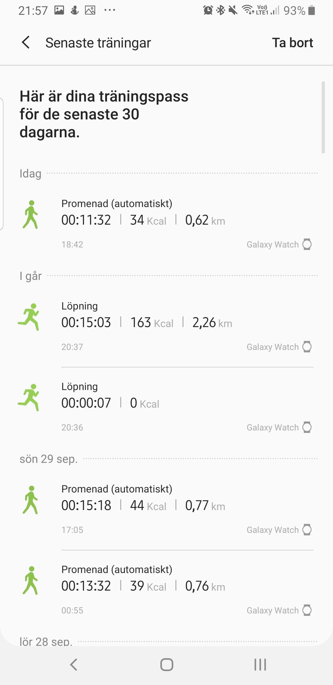 Samsung Health visar dock endast träningspass från de senaste 30 dagarna, vilket är lite underligt. Det gör det omöjligt att göra långsiktiga tillbakablickar, vilket innebär att det inte går att följa framsteg för exempelvis konditionsbaserad träning.