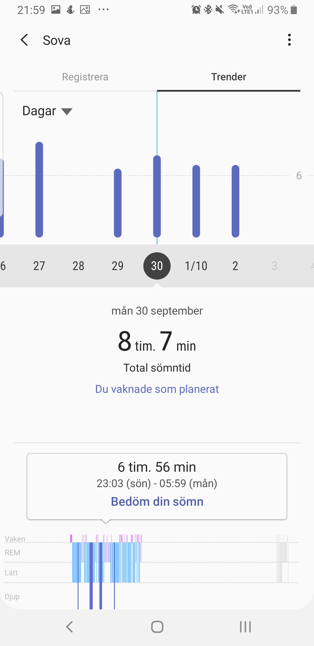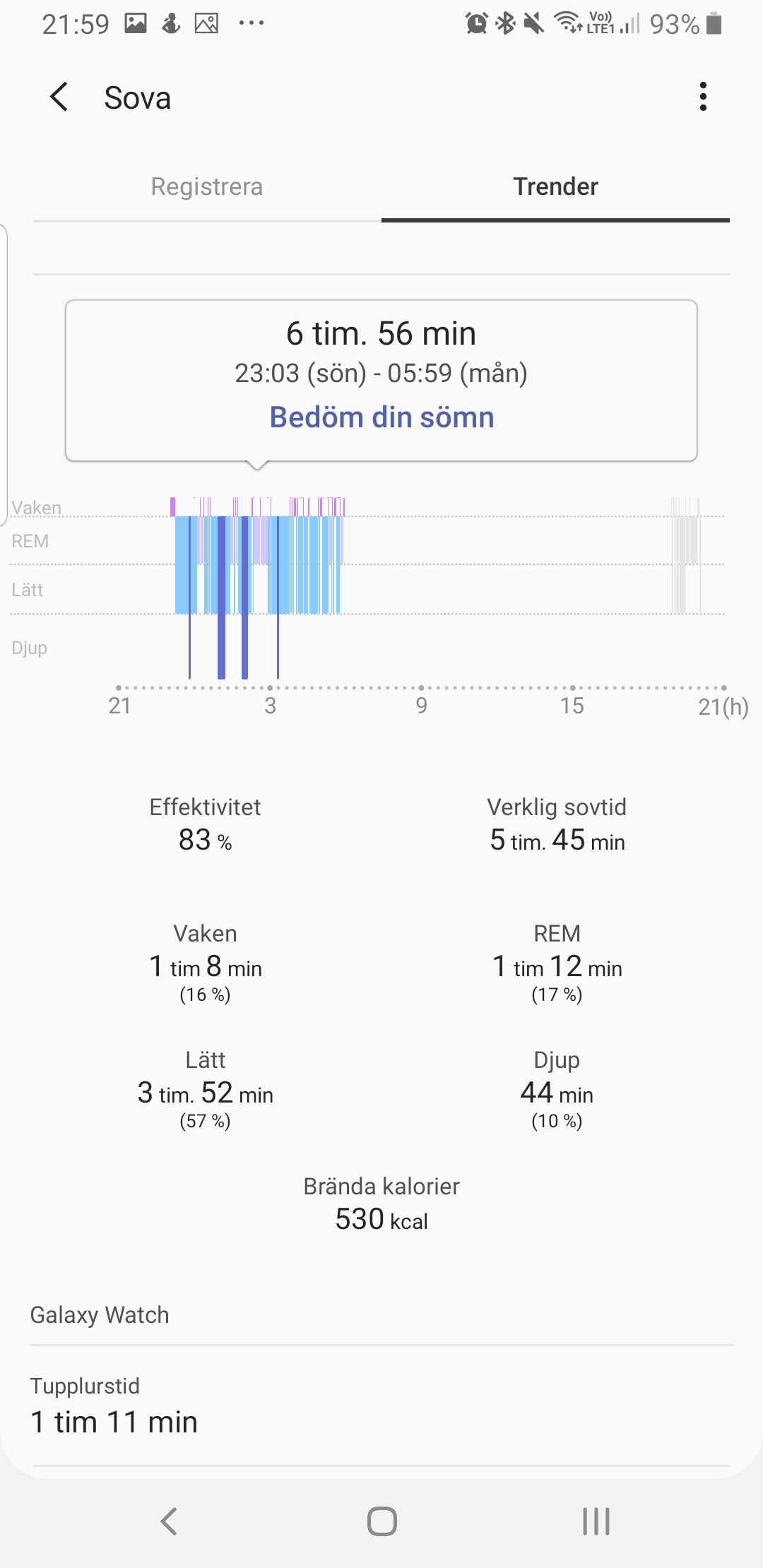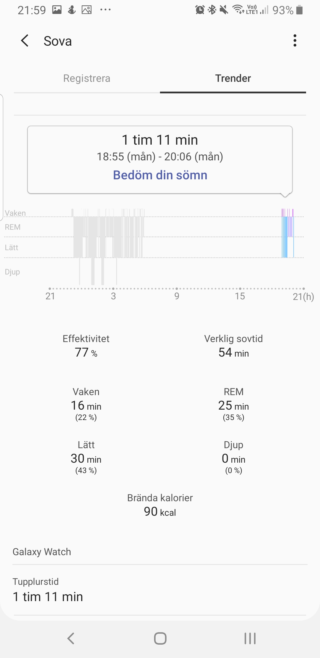 Just tupplurar är både Samsungs styrka och svaghet när det gäller sömnmätning. Galaxy Watch kan, jämfört med konkurrenter som Fitbit, mäta korta tupplurar med både tid och sömnstadier. Problem uppstår dock när klockan också räknar stillasittande eller långa sessioner av TV-seriemaraton som sömn. Här mäts då samtliga sömnstadier och de felaktiga mätningarna väger in i dagens totala sovtid. Det får oss att ifrågasätta sömnmätningens korrekthet överlag.
