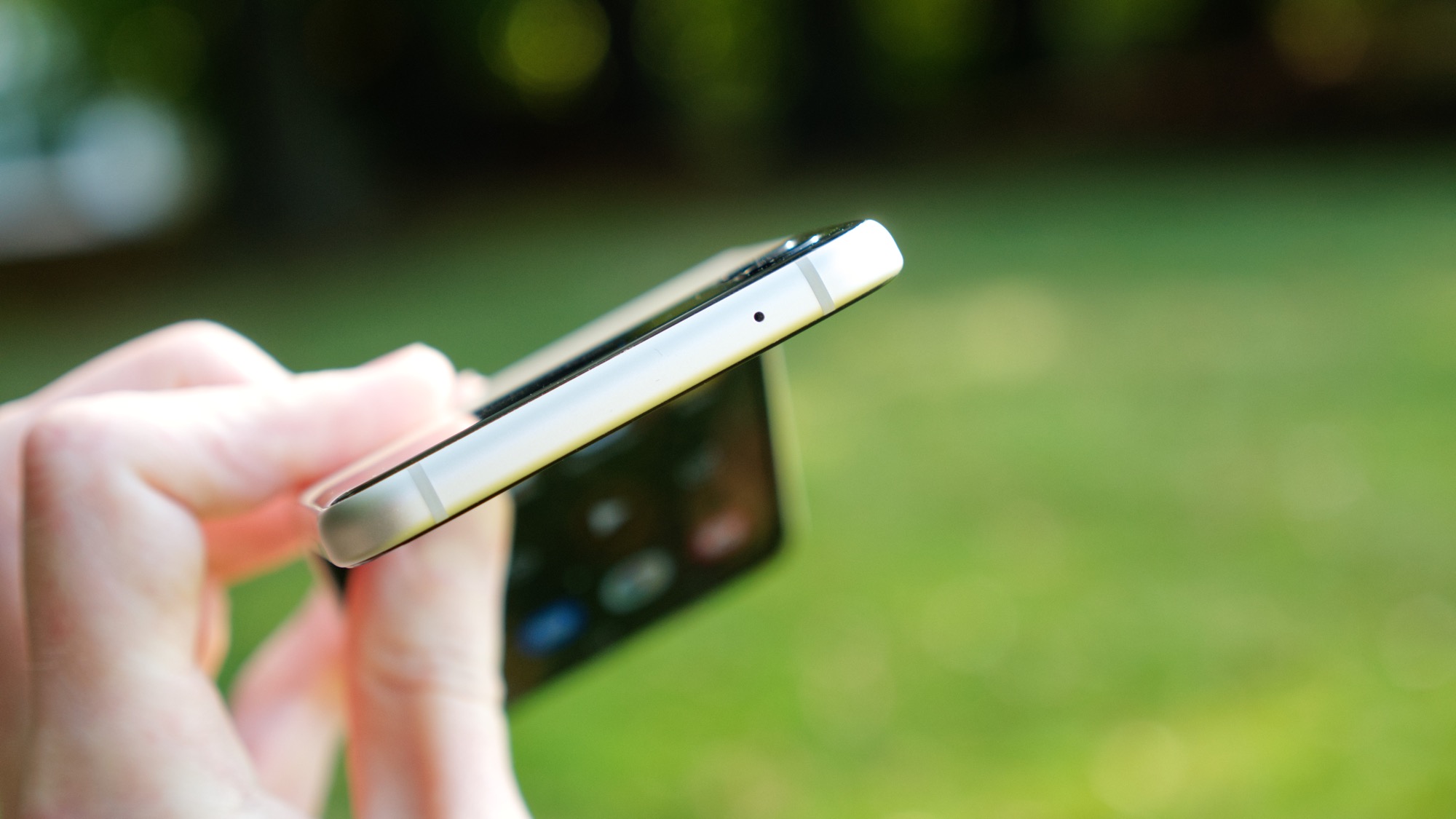 På vänster sida finns en kortläsare med plast för endast ett SIM-kort. Det kan kompletteras med ett eSIM men det går alltså inte att använda dubbla nanoSIM. Det finns inte heller någon microSD-plats. Längs ovansidan finns i övrigt bara en sekundär mikrofon. Undersidan bjuder på en mikrofon, en USB C-port och en högtalare.