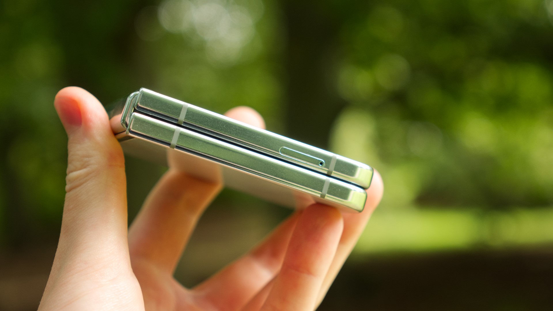 Z Flip 5 är byggd med metallsidor som ger den en stadig konstruktion. När den är ihopvikt känns den tung och lyxig i handen. Så fort vi viker ut den förändras allt. Vikten sprider ut sig i handen och telefonen känns plötsligt lätt. Det är inte så konstigt. Galaxy Z Flip 5 är några millimeter längre än den gigantiska Galaxy S23 Ultra men väger ändå 47 gram mindre.