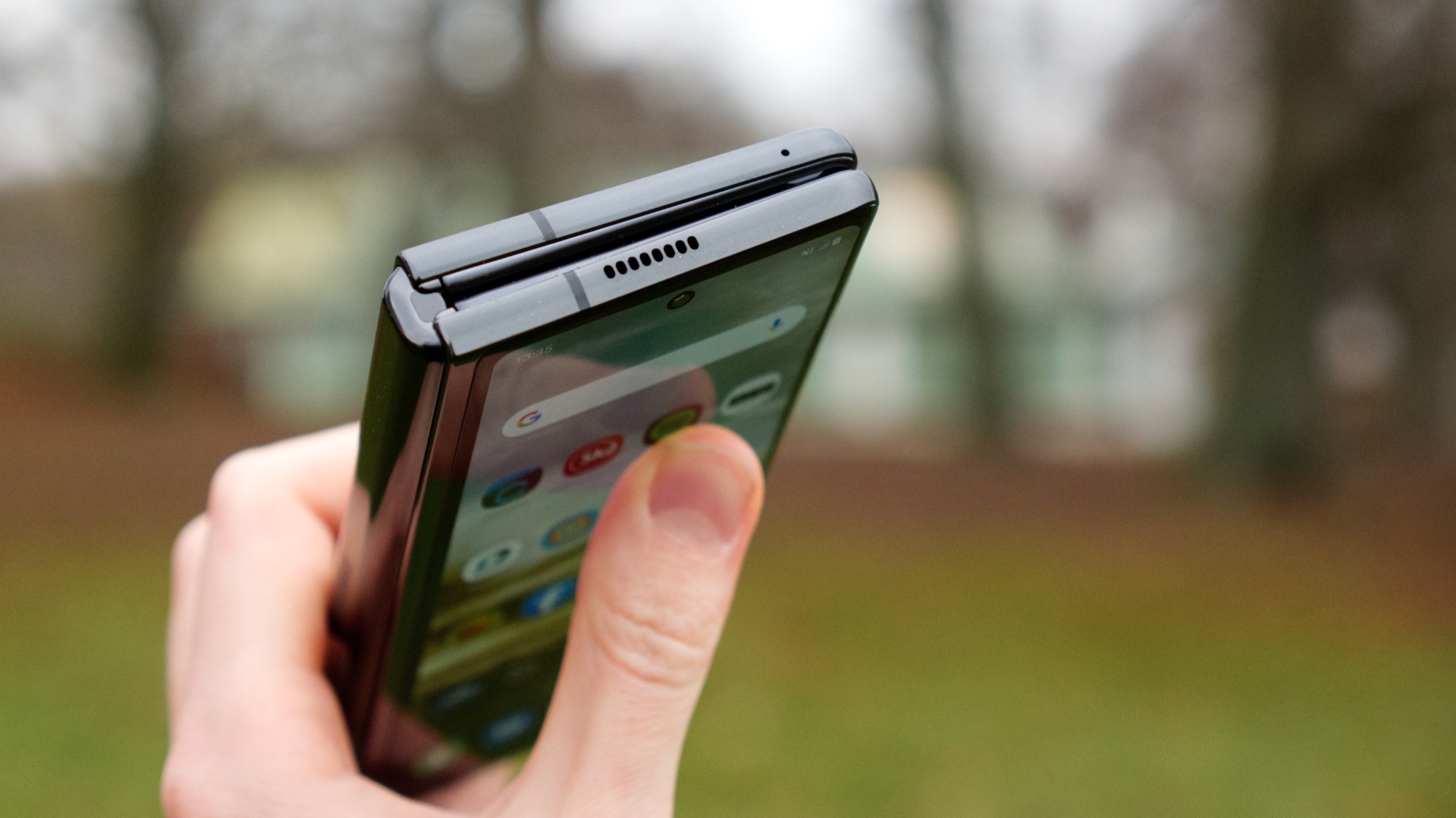 När den är ihopvikt har Galaxy Z Fold 2 ett minst sagt udda format. Den är faktiskt varken lika lång eller lika bred som många stora flaggskeppsmobiler men tjockleken och den höga vikten gör den klumpig. Vikten gör den särskilt jobbig att använda med en hand men för högerhänta är den åtminstone lätt att hantera eftersom skärmen sitter närmast högerkanten. Trots sin storlek och vikt är faktiskt Fold 2 en helt okej mobil för enhandsanvändning.