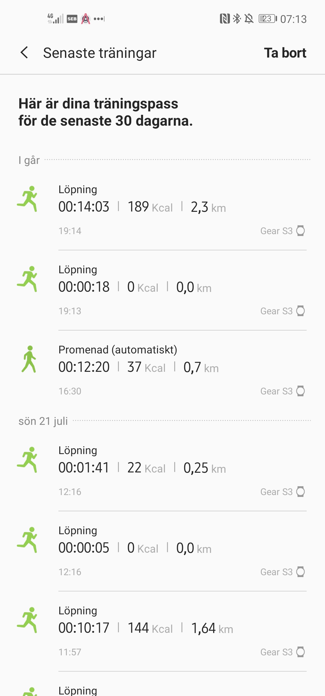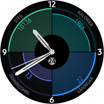 Samsung Gear S3 håller koll på daglig hälsa genom att mäta aktivitet, rörelse, stillasittande, sömn samt användarens puls. Dessa värden utvärderas och anges i Samsung Health-appen på klockan och telefonen. Under aktivitet hittar vi antal räknade steg och trappor samt kalorier. Under ett test på 500 steg räknar Gear S3 ett ynka steg för mycket. Trappor, eller Våningar som Samsung kallar det, mäts med hjälp av en inbyggd altimeter. Samsung klassar, precis som andra tillverkare, en våning som tre meter i ökning. Det är inte ovanligt att trappor missas och inte räknas alls eller att det rapporteras för få. När vi går upp för två trappor rapporterar den rätt tre av fyra gånger.