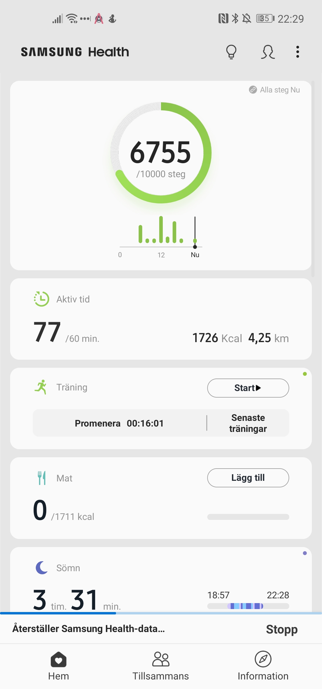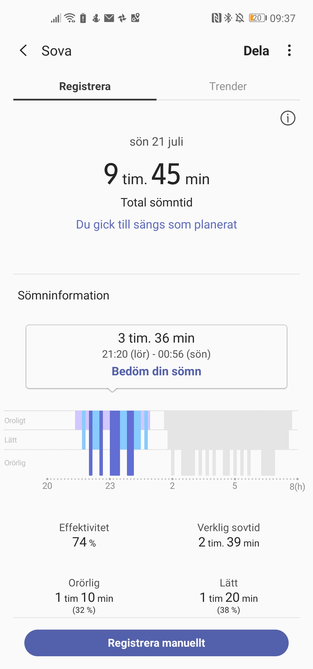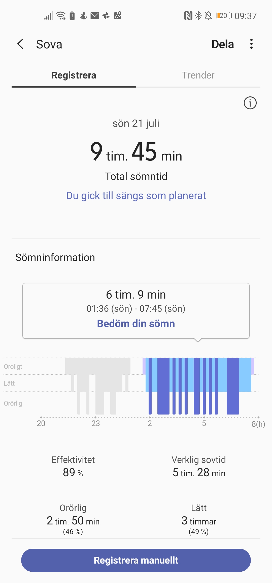 Sömnmätningen i sig själv är svår att validera men det vi kan påpeka är att den delar upp sömnperioder om användaren vaknar. Då blir en natts sömn två olika sömnperioder. Detta är annorlunda i jämförelse med Fitbit, Garmin och Huawei, som registrerar uppvaknanden utan att faktiskt avbryta mätningen – vilket ger en tydligare överblick. Samsungs uppmätta sömntillfällen slås sedan ihop till ett värde kallat Total sömntid, som också räknar med tupplurar, både faktiska tupplurar och felaktiga.