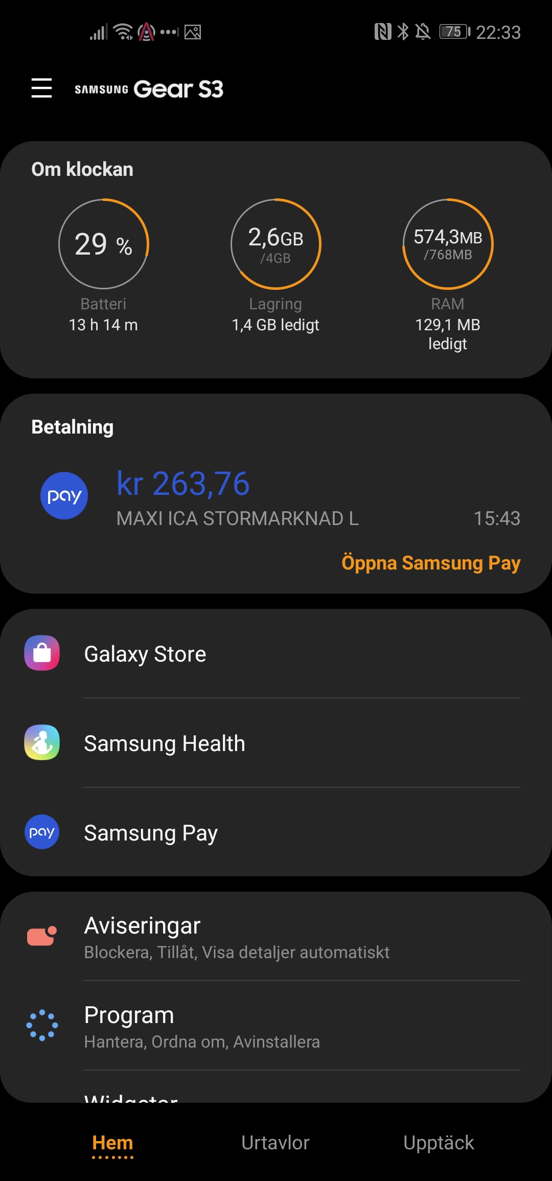 Läs mer om mjukvaranSamsungs Gear S3 kör det egna operativsystemet Tizen och har nyligen uppdaterats till den senaste versionen, One UI. Ett svep ned från toppen av skärmen visar snabbinställningar och dessa kan nås från samtliga appar. Tizen är uppbyggt så att notiser ligger till vänster om klockansiktet. På höger sida av klockansiktet ligger widgetar och det är här många interaktioner med applikationer sker. Eftersom detta har varit Tizens upplägg sedan flera år tillbaka har många appar en dedikerad widget, till skillnad från Googles Wear OS som nyligen fick en liknande design. Samsungs stora tillgång är den roterande boetten som smidigt kan användas för att bläddra mellan notiser och widgetar.