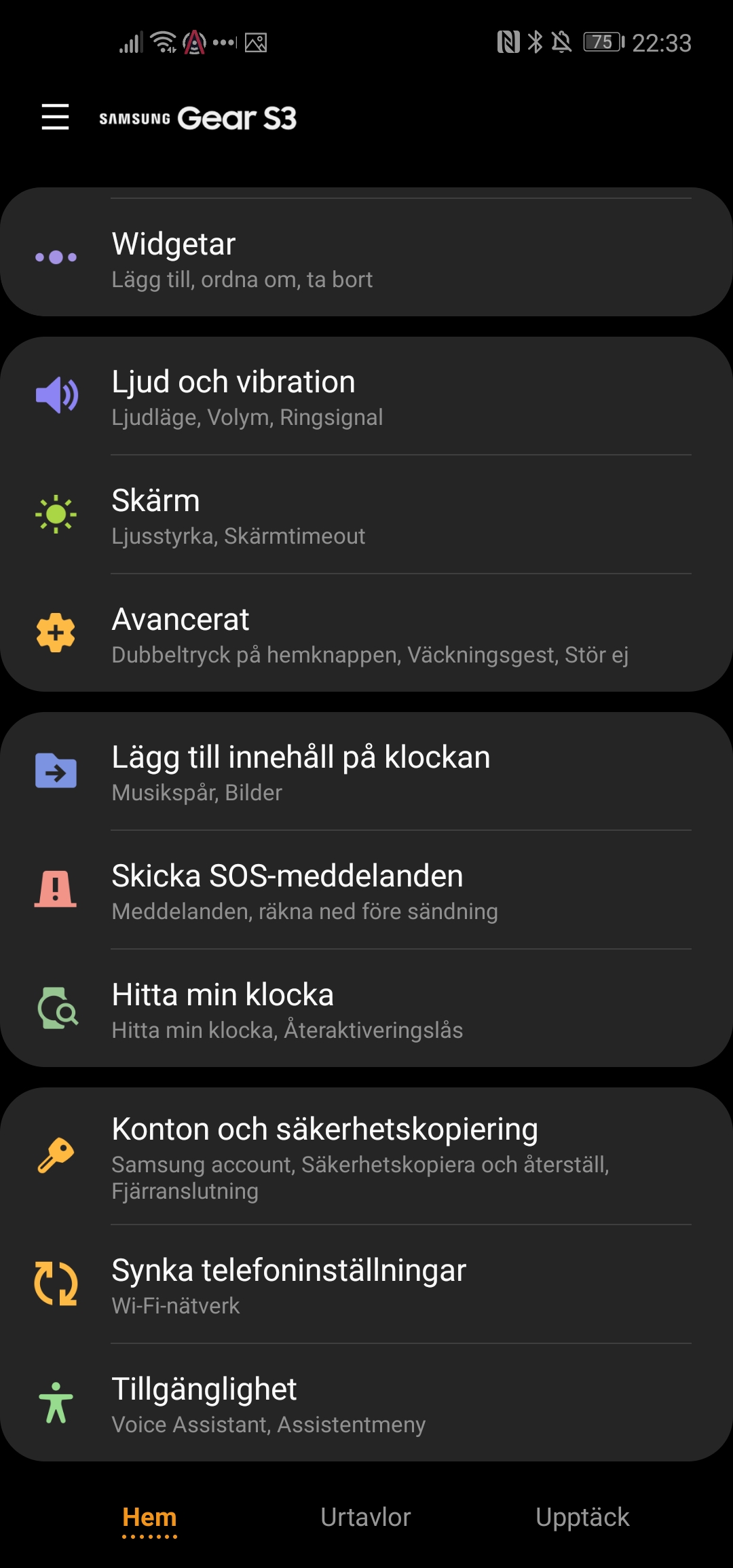 Samsung Gear S3 Classic ansluter till telefoner genom Bluetooth, eller Wi-Fi om tillgängligt, och kommunikationen sköts av appen Galaxy Wearable. Här finns möjligheten att djupdyka i klockans inställningar från notiser till ordningen på applådan och widgetar. Möjligheten att ställa in från telefonens större skärm är något vi uppskattar. För att spara träning- och hälsodata används appen Samsung Health, som erbjuder både en enkel överblick och djupdykning om så önskas. Här finns också sociala aspekter med gemensamma utmaningar, tävlingar mot andra användare och ett så kallat forum som är i beta. Forumet agerar som ett sociala medie där användare kan dela prestationer, bilder och pågående utmaningar.