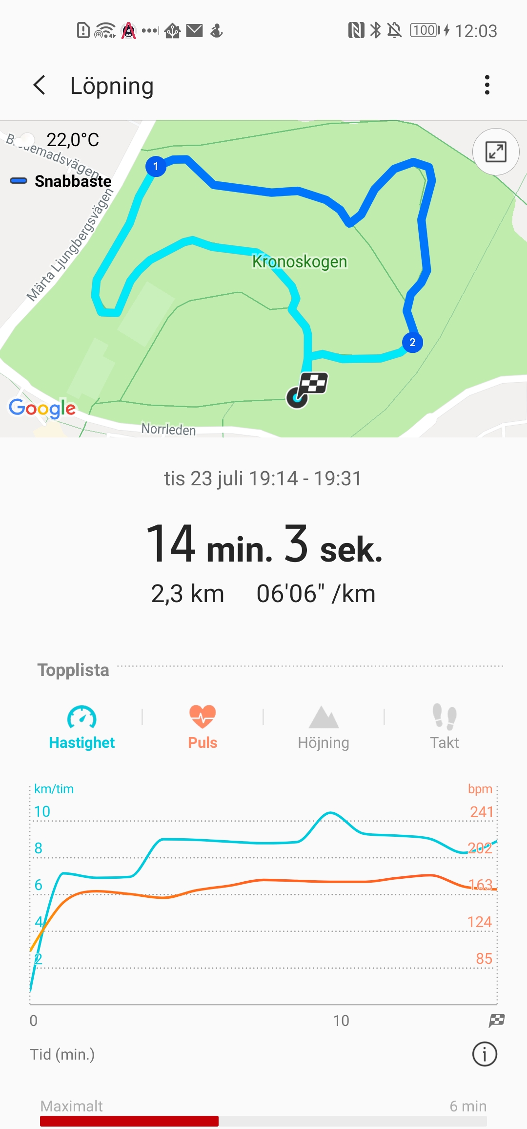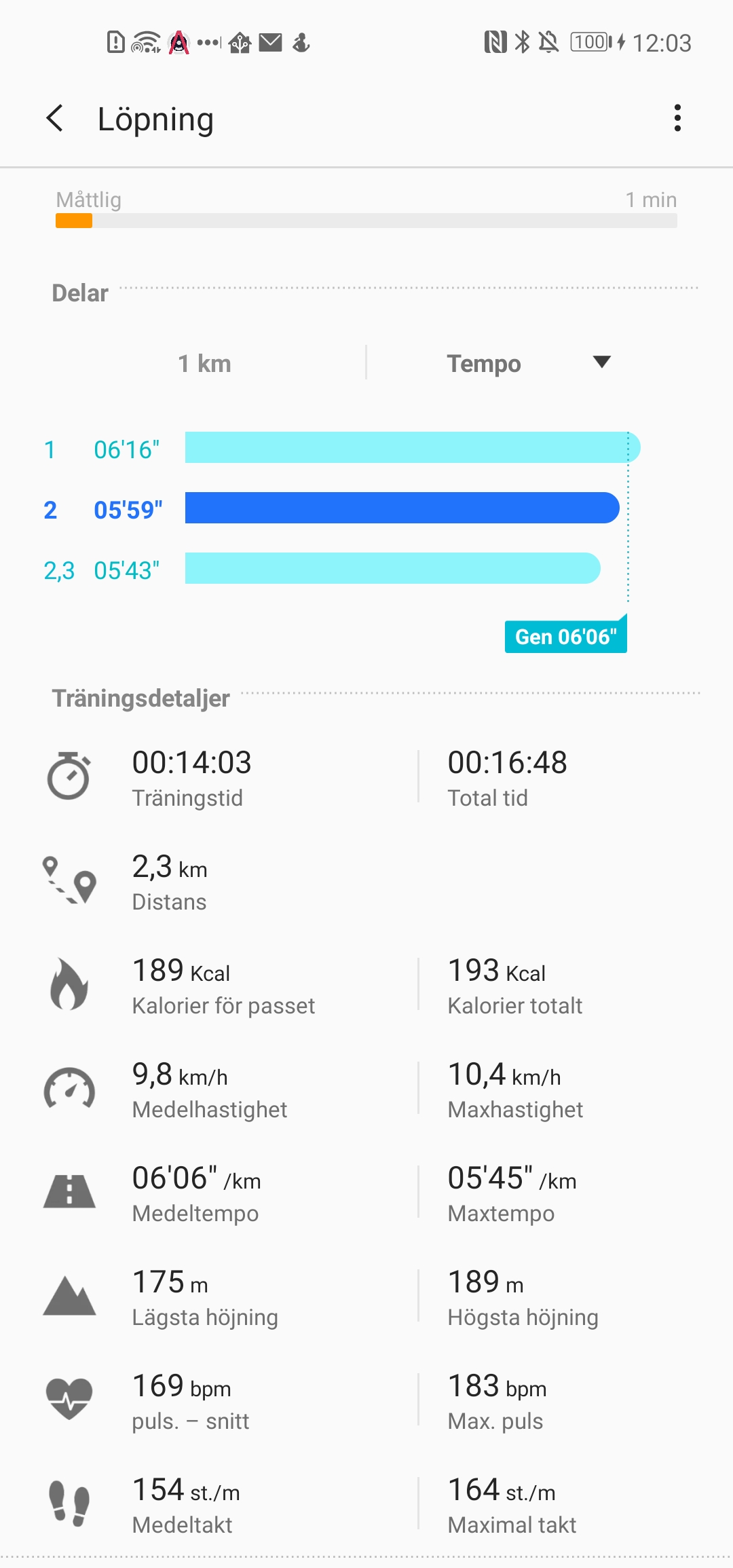 Data synkroniseras efter passet till telefonen. Där presenteras diagram för Hastighet, Puls, Höjning och Takt smidigt och det går enkelt att jämföra om pulsen ökade i takt med exempelvis hastigheten. Det lagras en bra mängd information om enskilda träningspass där det mesta sparas som medelvärden och högsta värden. Kartan som målas upp för GPS-pass är också enkel att följa med tydligt numrerade delar. Dessa delar matchar dock inte det mål för avstånd som vi valt i förväg och markeras alltid per kilometer.