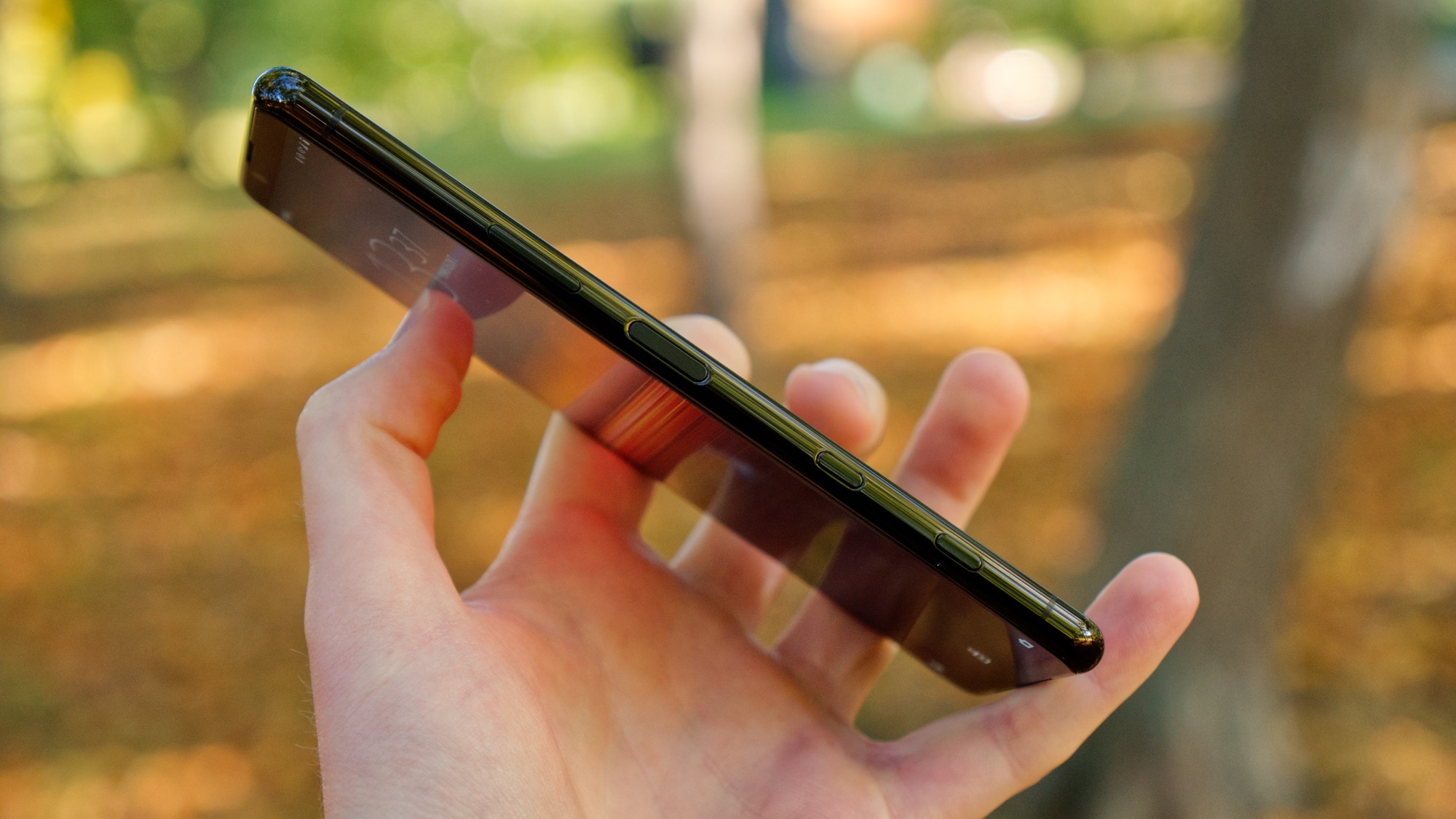 Sidorna är lätt rundade och gjord av polerad metall. På höger sida finns en fingeravtrycksläsare som också fungerar som på/av-knapp. Sonys fingeravtrycksläsare har aldrig varit bäst i branschen och den är inte heller i Xperia 5 II. Den kräver en noggrann registrering för att fungera pålitligt. När ett fingeravtryck har registrerats är den i alla fall snabb och praktiskt placerad, åtminstone för högerhänta.