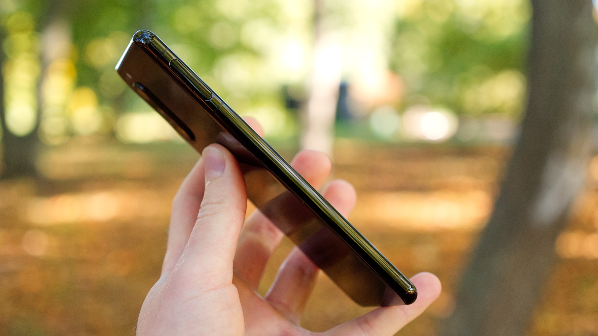 Ovanför läsaren sitter två volymknappar som ger bra fysisk återkoppling och är lätta att känna sig fram till. Under läsaren finns ännu en knapp, som inte sticker ut särskilt mycket. Det är en dedikerad knapp för Google Assistent. Vi gillar designen av knappen eftersom dess platta profil gör den svår att trycka av misstag. Det gör att Xperia 5 II undviker de irriterande tryck som ofta gör att vi stänger av liknande knappar på andra mobiler. Knappen går för övrigt inte att stänga av eller omprogrammera. Längst ner på höger sida finns slutligen en dedikerad kameraknapp. Den fortsätter att vara en Sony-unik funktion som är mycket tacksam för fotografering. Vi uppskattar särskilt knappens mellanläge för fokus, som gör det enkelt att låsa fokus.