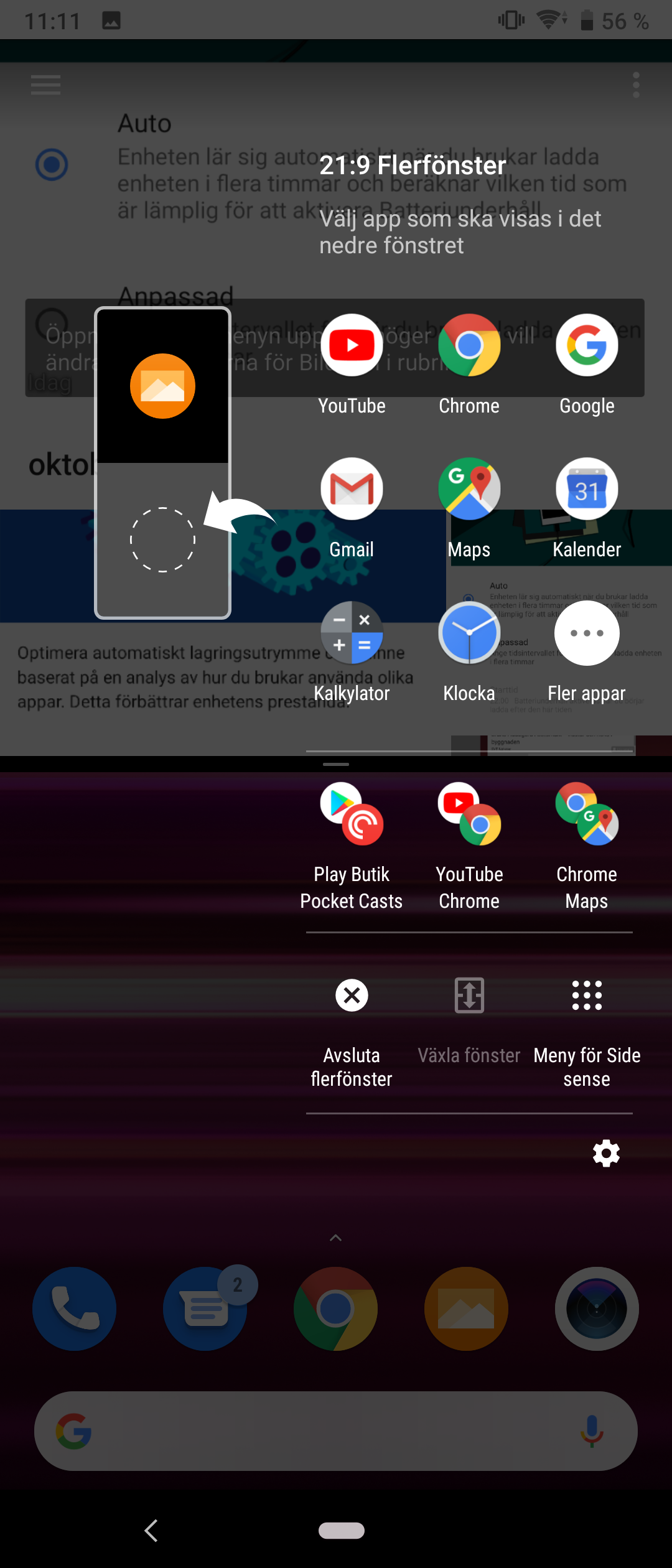 Side sense är en funktion som introducerades med XZ3 och som återkommer i Xperia 5. Funktionen kan aktiveras med tryck eller svepningar längs sidan av skärmen. Eftersom skärmen i Xperia 5 inte är rundad längs sidorna, är Side sense nu lite klurigare att aktivera. Med lite träning funkar det ändå ganska bra. Side sense kan användas för att snabbt starta favoritappar. En ny flerfönsterfunktion gör det också möjligt att snabbt öppna förkonfigurerade vyer av flera appar. Det är särskilt praktiskt på den avlånga skärmen. Tillsammans med en speciell flerfönsterknapp som visas när en appikon trycks in från hemskärmen och ett förbättrat fönsterhanteringssystem har Sony gjort bra justeringar för att göra riktig multitasking ännu enklare. Med det sagt är Side sense inte riktigt lika användbart nu när Sony har bytt till Androids nya gestbaserade navigeringssystem, som ändå gör det möjligt att öppna applådan från alla delar av operativsystemet.