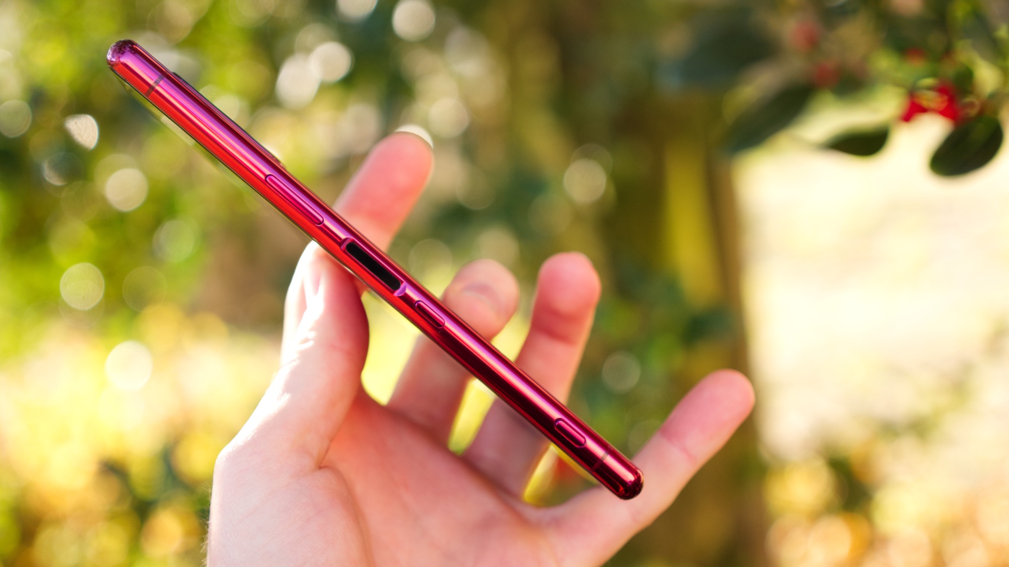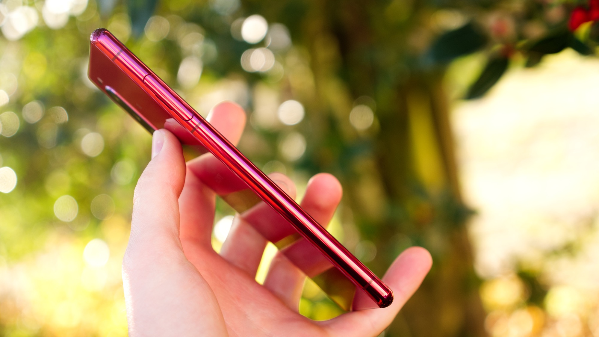 Längs sidorna av Sony Xperia 5 finns polerad aluminium som ger telefonen ett glansigt utseende. Längs höger sida finns alla hårdvaruknappar. Det inkluderar Sonys fortsatt marknadsunika kameraknapp med ett dedikerat halvläge för att låsa fokus. Knappen är en trevlig bonus för kameraintresserade som snabbt vill kunna aktivera kameran och ha bra kontroll över sin fotografering. Ovanför den finns en på/av-knapp. Den sitter på samma plats som på/av-knappen på Xperia 1, åtminstone proportionerligt så. Eftersom hela telefonen är betydligt mindre är knappen också placerad cirka en centimeter längre ner. Det gör att personer med stora händer potentiellt kan tycka att den sitter lite för långt ner. I det fallet kan kanske Xperia 1 helt enkelt vara ett bättre alternativ.