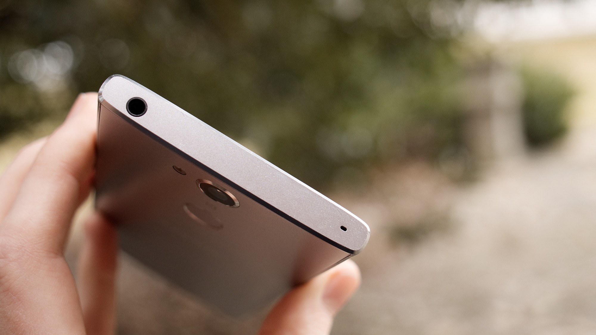 Strax ovanför fingeravtrycksläsaren sitter en kamera. Den sticker ut en bråkdel av en millimeter från telefonen men skyddas av en tunn metallram som sitter runt glaslinsen. Bredvid kameran sitter en LED-lampa som kan hjälpa till i mörka miljöer.