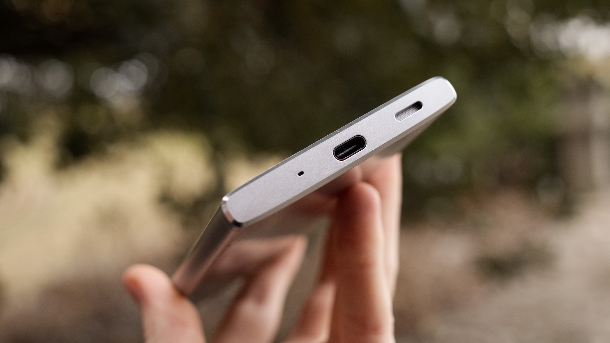 På översidan av telefonen finns en 3,5 millimeter hörlursport och på undersidan hittar vi en mikrofon, USB Typ-C-port med stöd för USB On-The-Go och en högtalare. Både under- och översidan av XA2 är gjorda av metall men har en slipad kant. Slipningen gör tyvärr inte tillräckligt mycket för att göra telefonen helt ergonomisk. Eftersom metallen inte är tillräckligt rundad kan telefonens nedre hörn kännas vassa och obehagliga i handen.