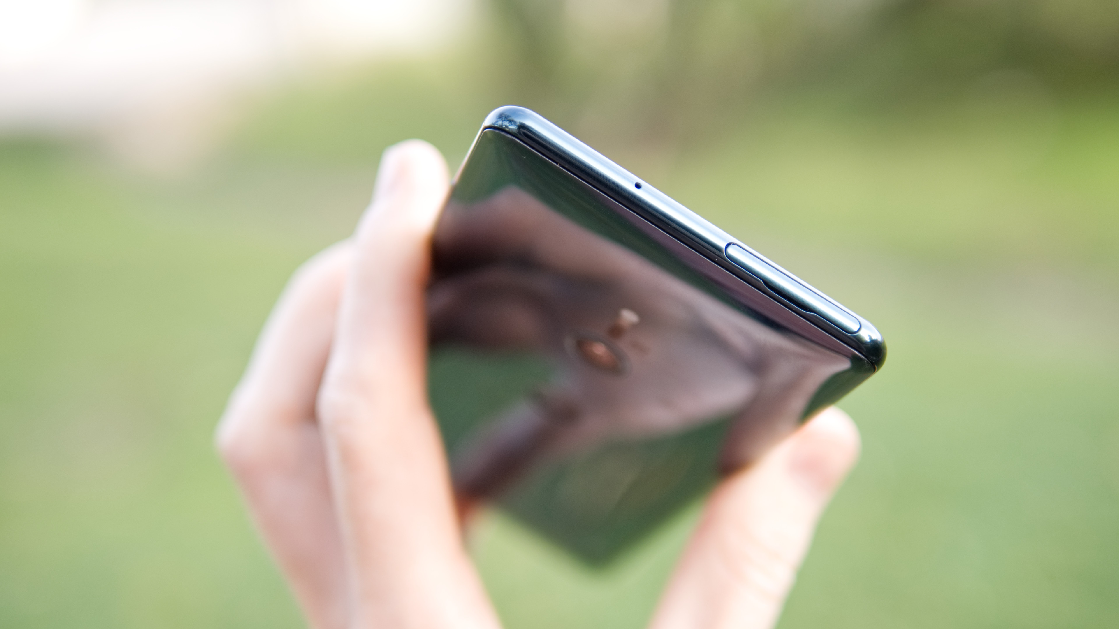 Glas möter metall vid sidorna av XZ3. På höger sida finns en på/av-knapp och två volymknappar. Sony fortsätter dessutom vara så gott som ensamma om att ha en kameraknapp med ett mellanläge för autofokus. Det är riktigt användbart, särskilt för dig som gillar att fota.