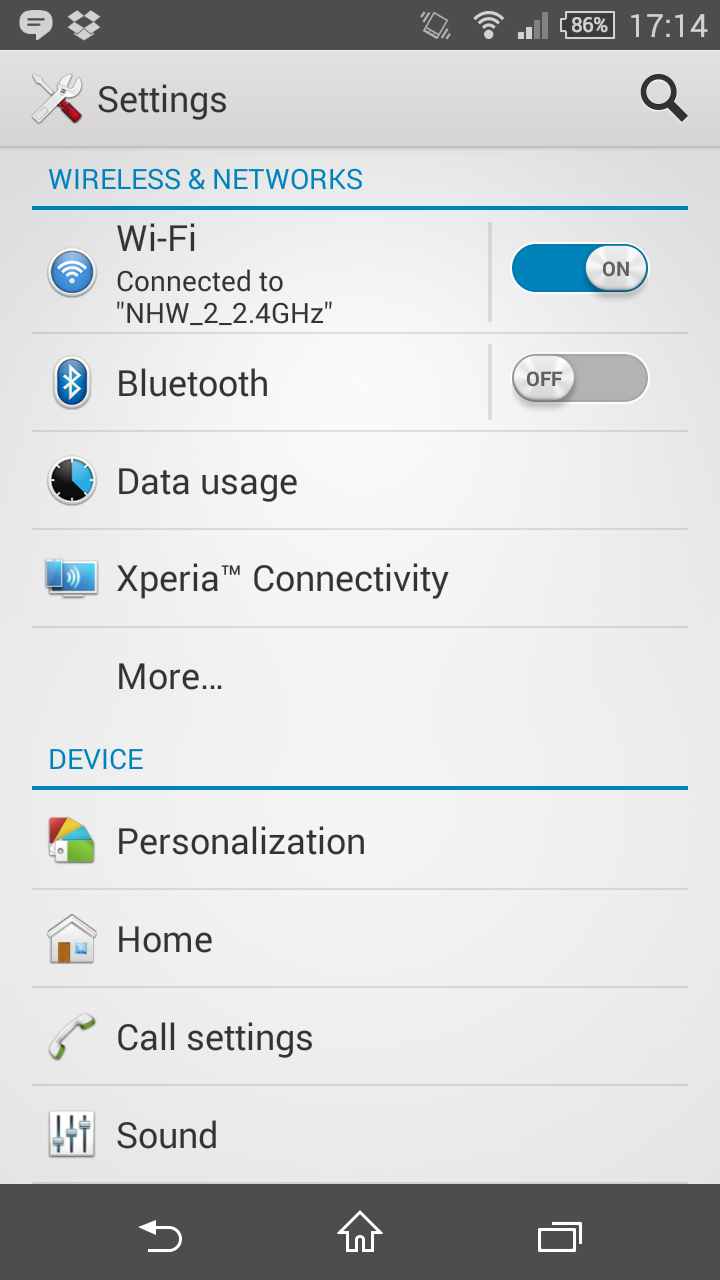 I telefonens inställningar finns mer eller mindre samma inställningsmöjligheter som i Samsung Galaxy Alpha och merparten av alla Android-telefoner. Här kan du ansluta till nätverk, ställa in språk, avinstallera appar och välja hemskärm. Här finns även möjlighet att ansluta en Playstation-handkontroll (Dualshock 3 eller 4) trådlöst för mobilspel.