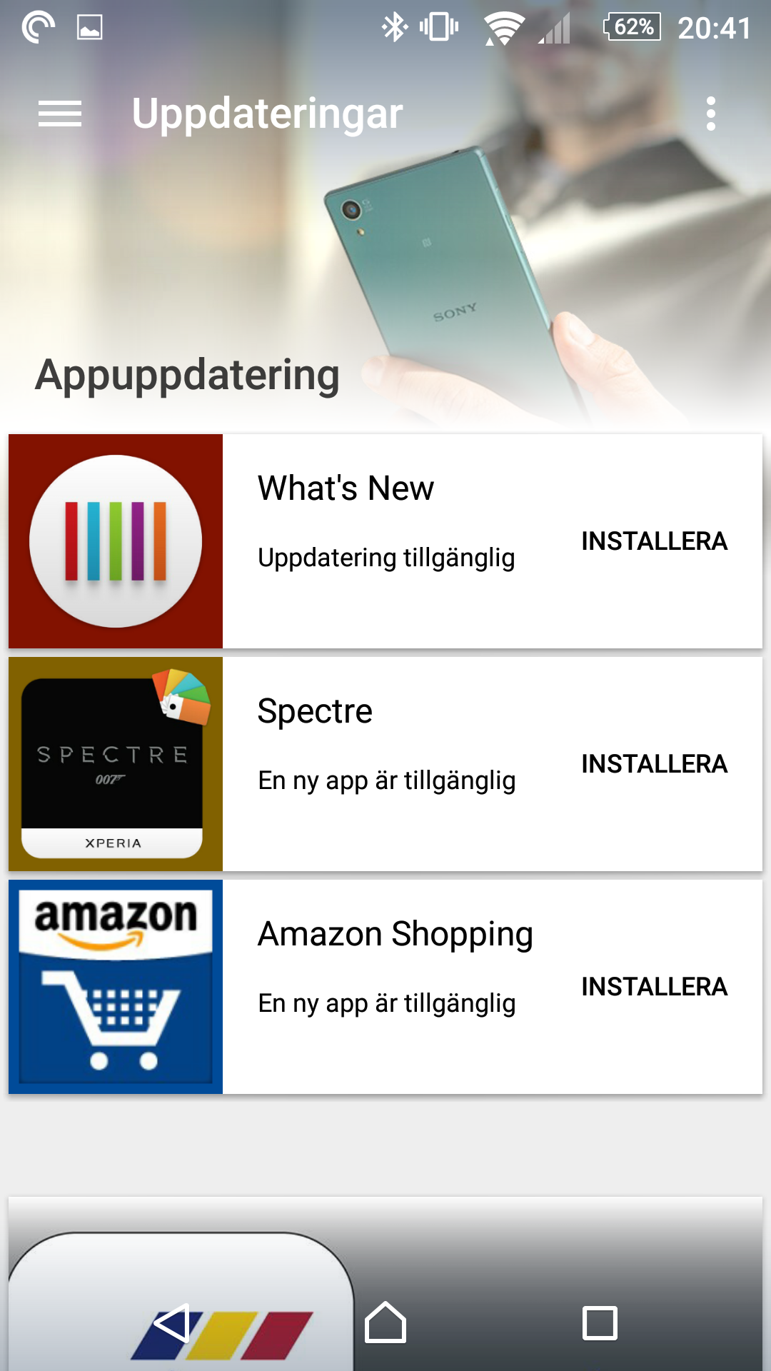 Det mest irriterande med appen är att den skickar notiser till användare om att det finns nya appar tillgängliga som Sony tycker att användare bör installera.Under vår testperiod fick vi exempelvis två notiser: ”Spectre – En ny app är tillgänglig” och ”Amazon Shopping – En ny app är tillgänglig”. Notiserna ledde till What’s New-appen som föreslog att vi skulle installera apparna på vår telefon. Det är inte orimligt att tänka att ovana användare skulle kunna tro att apparna måste laddas ner eftersom de listas som ”Uppdateringar”, även om de aldrig varit installerade på telefonen förut.