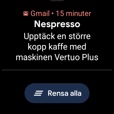 Läs mer om mjukvaranWear OS har ett ganska traditionellt gränssnitt för smarta klockor. Med ett svep ned visas snabbinställningar och ett svep uppåt visar notiser. Dessa kan tyvärr enbart nås från klockansiktet, vilket gör dem mindre tillgängliga än på Apples WatchOS eller Samsungs Tizen. Till höger om klockansiktet hittar vi upp till fem så kallade Tiles, eller Kort, som fungerar som widgets. Det är de installerade apparna som avgör hur många Kort det finns att välja mellan och då detta är en ny funktion i Wear OS finns det inte allt för många att välja mellan i nuläget.