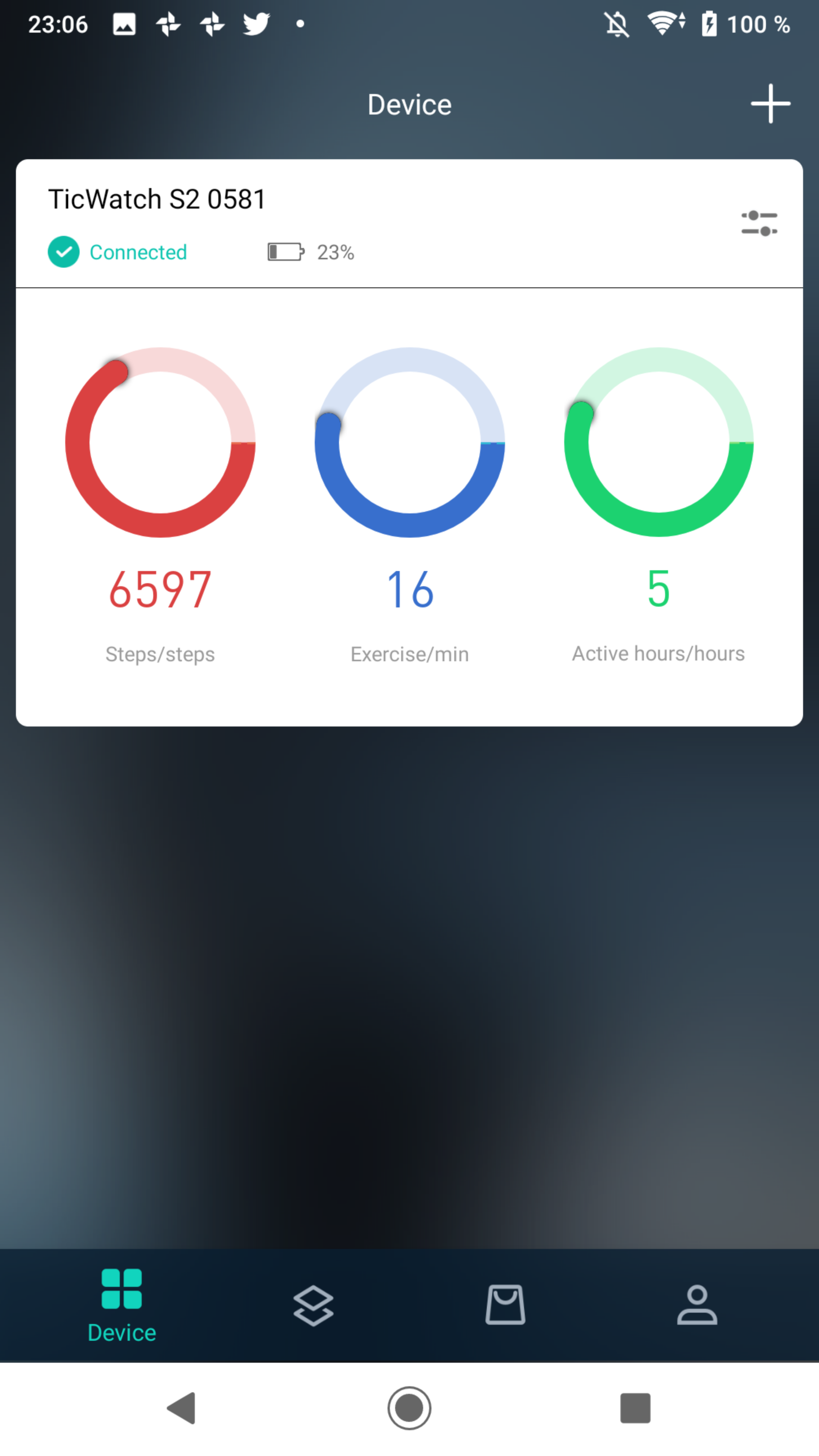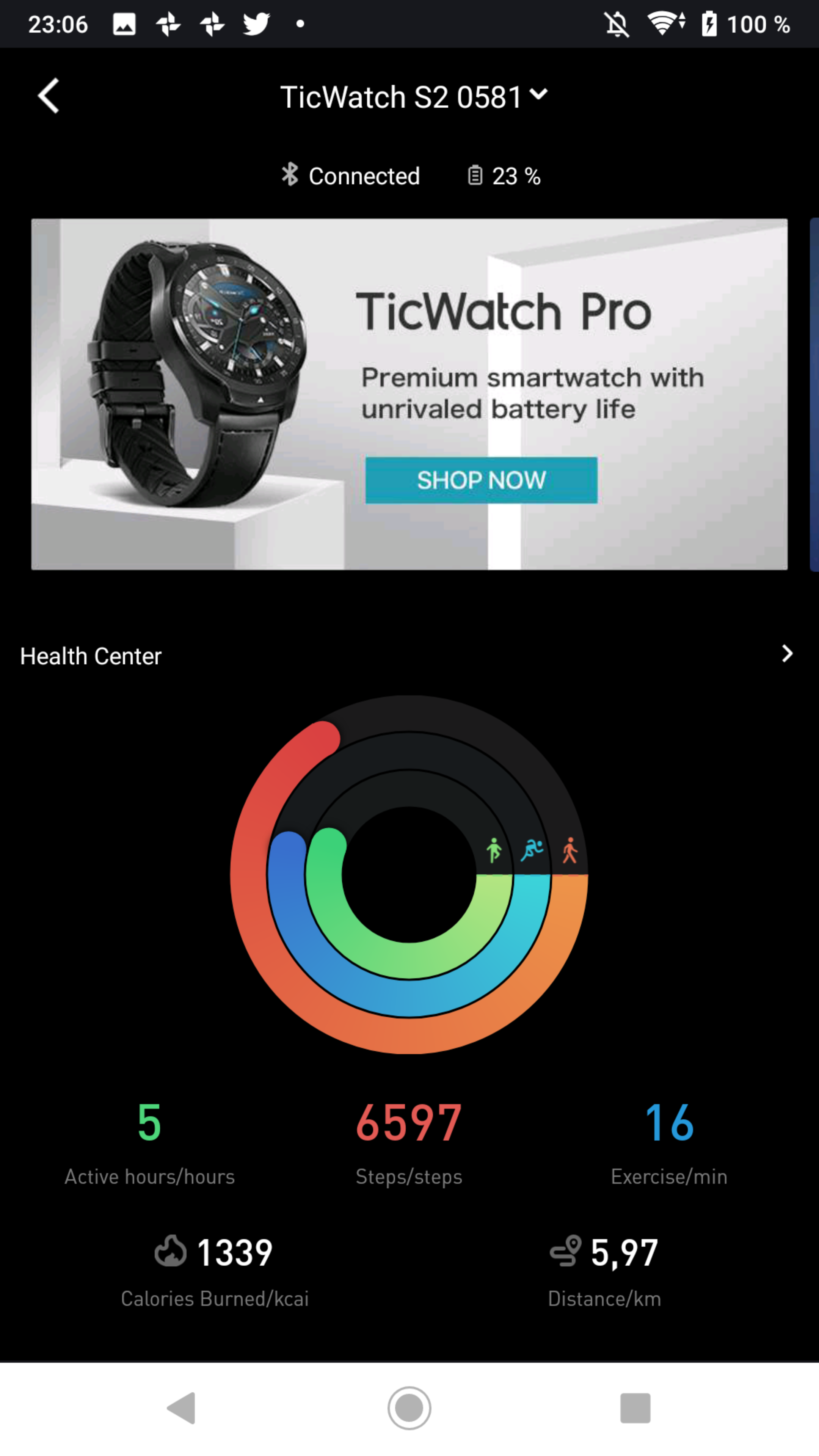 Mobvois app används också för diverse andra produkter som tillverkaren säljer, såsom deras smarta högtalare TicHome mini. Appen räds inte för att påminna om att Mobvois produkter finns att köpa genom reklam. Om det enbart är klockan som är av intresse kan appen då kännas överflödig och ofokuserad, med flikar som förblir helt orelevanta. Vid telefonbyten synkroniseras tyvärr inte träningsdata fullt ut. Detta resulterar i att träningspass finns listade utan avancerad data så som pulsmätning, stegfrekvens eller den utmålade kartan.