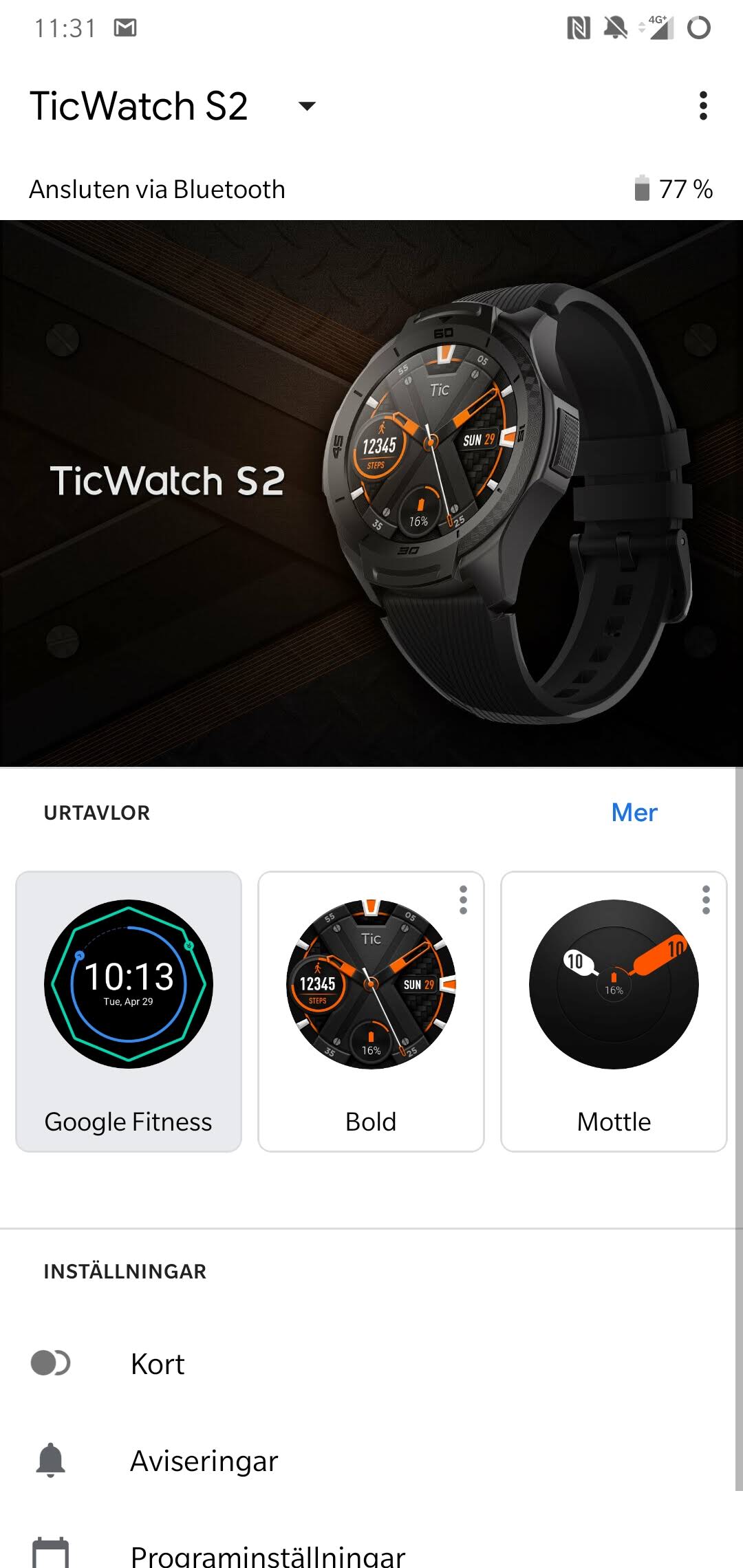 Vad gäller uppkopplingen till en smartphone är Wear OS det mer förvirrande alternativet på marknaden. Här hittar vi inte en kompanjonapp, utan i Ticwatch S2s fall, tre. Appen Wear OS finns till både iOS och Android och styr kopplingen mellan telefonen och smartklockan. Här finns enkla inställningar för vilka appar som får skicka notiser till klockan, huruvida kalendern ska synkroniseras och vilket klockansikten som ska användas. Det är synd att det inte går att djupdyka i klockans inställningar från telefonens större skärm. Det är något som Samsung och Apples alternativ erbjuder. Googles hälsoapp, Google Fitness, är förinstallerad på Wear OS och sparar aktivitetshistorik som klockan samlar in. I tillägg till Googles egna utbud har Mobvoi också en egen app som sparar träning- och hälsodata från tre appar på klockan. Vilken av dessa två appar som ska användas är upp till användaren. Alternativet är att hitta en tredjeparts-app i Google Play.