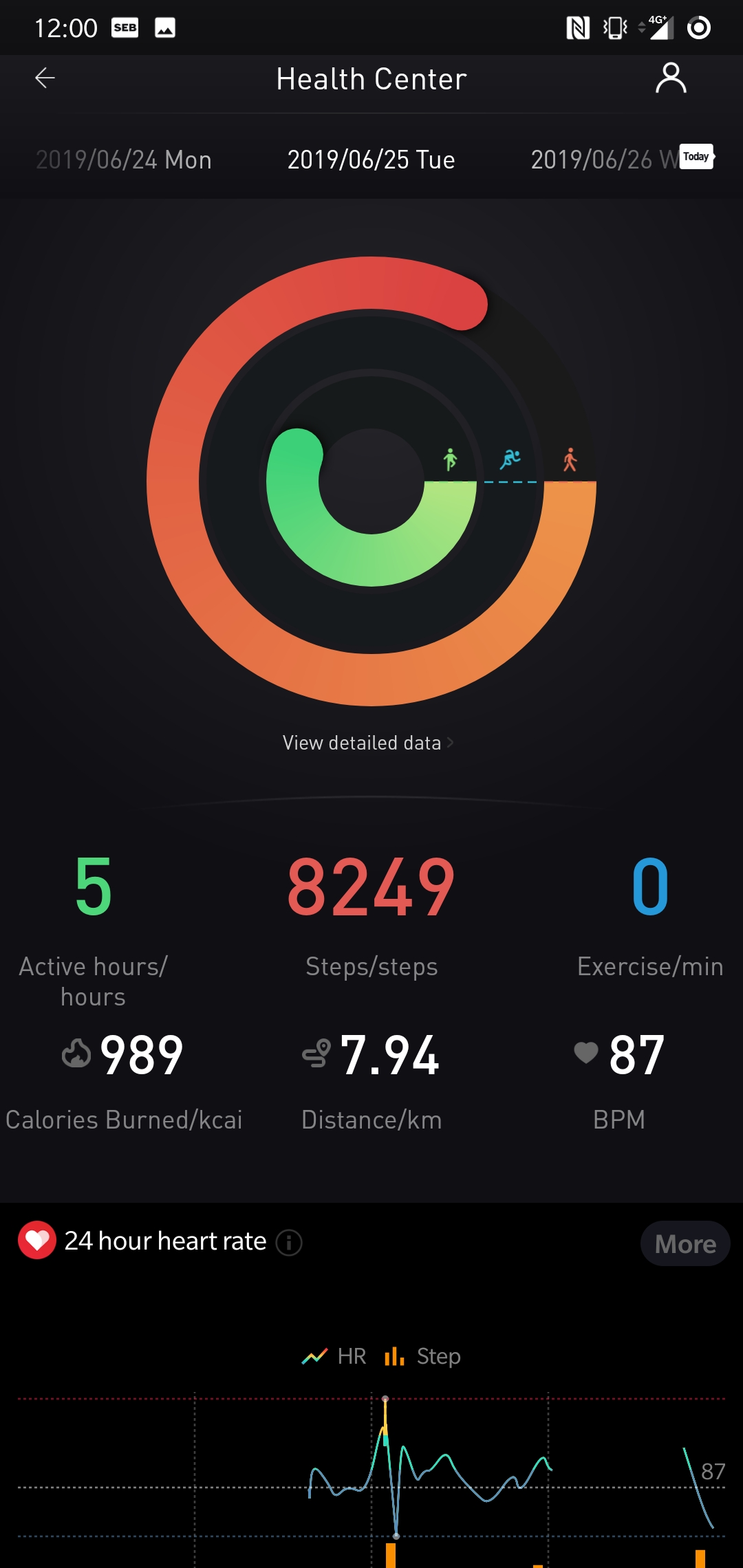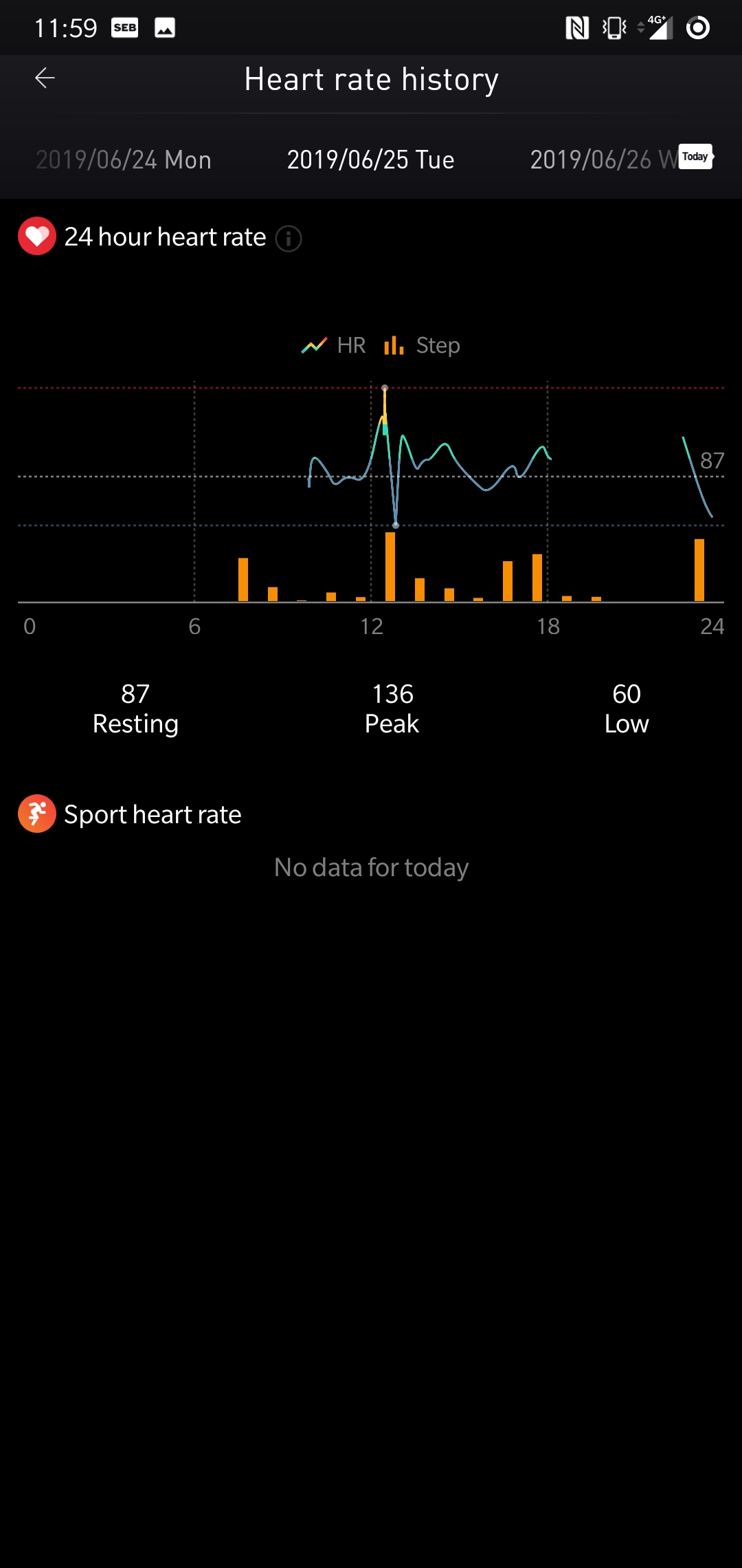 Mobvoi listar dagliga pulsvärden utifrån högsta- och lägsta puls. Den senaste uppdateringen ger också ett värde för vilopuls som indikerar hur vältränad eller hälsosam användaren är. Kontinuerliga pulsmätare läser ofta av det ursprungliga vilovärdet vid uppvaknande på morgonen, då Ticwatch S2 ofta ligger på laddning. Detta resulterar i att vilopulsen ofta ligger minst 10 slag för högt vilket påverkar värdet genom dagen. På klockan går det att se vilopulsens meddelvärde över en vecka, som då påverkas negativt av felaktiga värden. Vi tycker också att det är konstigt att medelvärdet inte går att avläsa i telefonappen.
