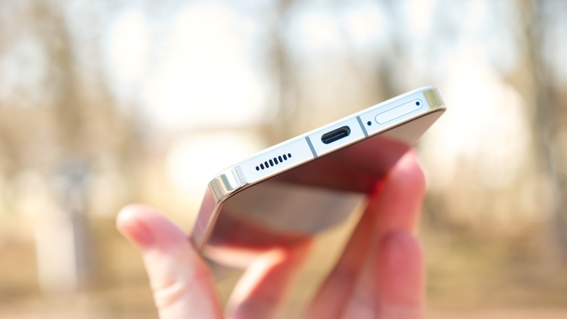 Längs undersidan finns en USB C-port som tyvärr är begränsad till USB 2.0. Här finns också en kortläsare som har plats för dubbla nanoSIM-kort men inget microSD-kort. Telefonen har också stöd för eSIM.