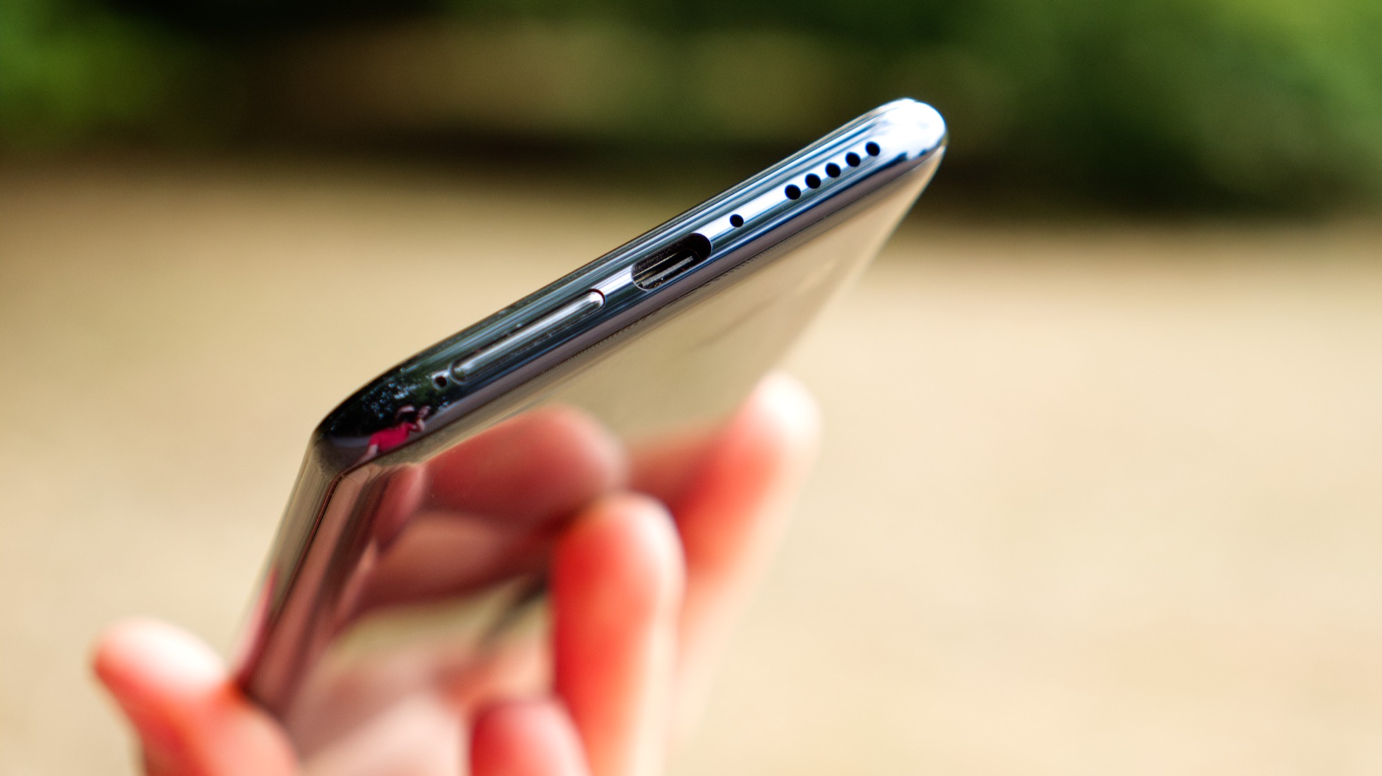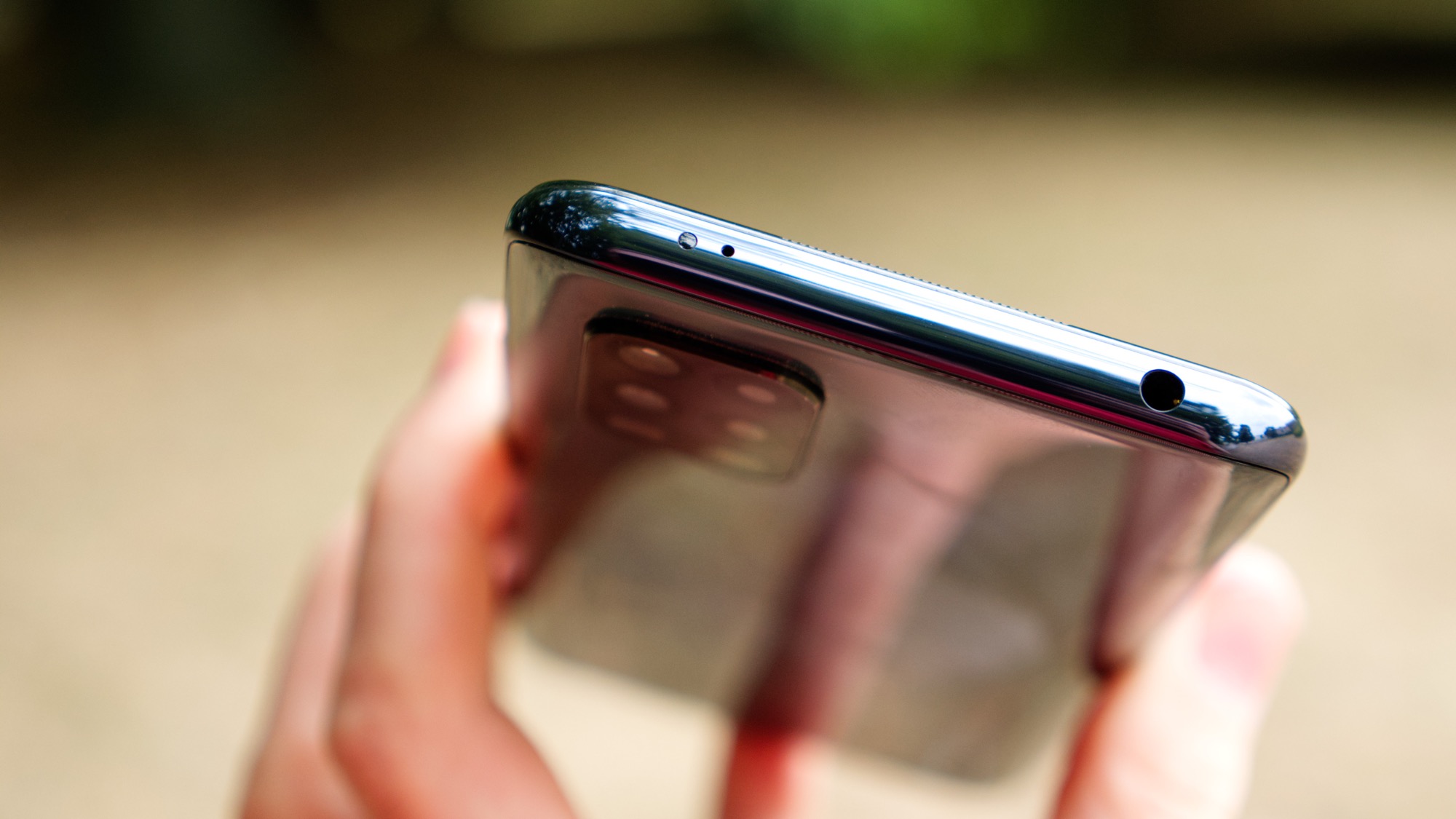 Glaset på baksidan möter en ram av plast. Den har en blank yta som får den att se ut som polerad metall. Telefonen är också stadig i sin konstruktion. Även om plast inte ger den ”kalla” lyxkänsla som metall kan ge, så känns inte Mi 10 Lite billig i handen. Längs den högra plastsidan finns i alla fall en på/av-knapp och två volymknappar. De är praktiskt placerade och ger bra fysisk återkoppling. Längs ovansidan finns en hörlursport, en IR-sändare och en sekundär mikrofon. Undersidan bjuder slutligen på en USB Typ C-port, en mikrofon, en högtalare och en kortläsare. Läsaren har utrymme för dubbla nanoSIM-kort men inget microSD-kort. Bristen på microSD-kort kan vara en anledning att välja en modell av Mi 10 Lite med 128 GB intern lagring.