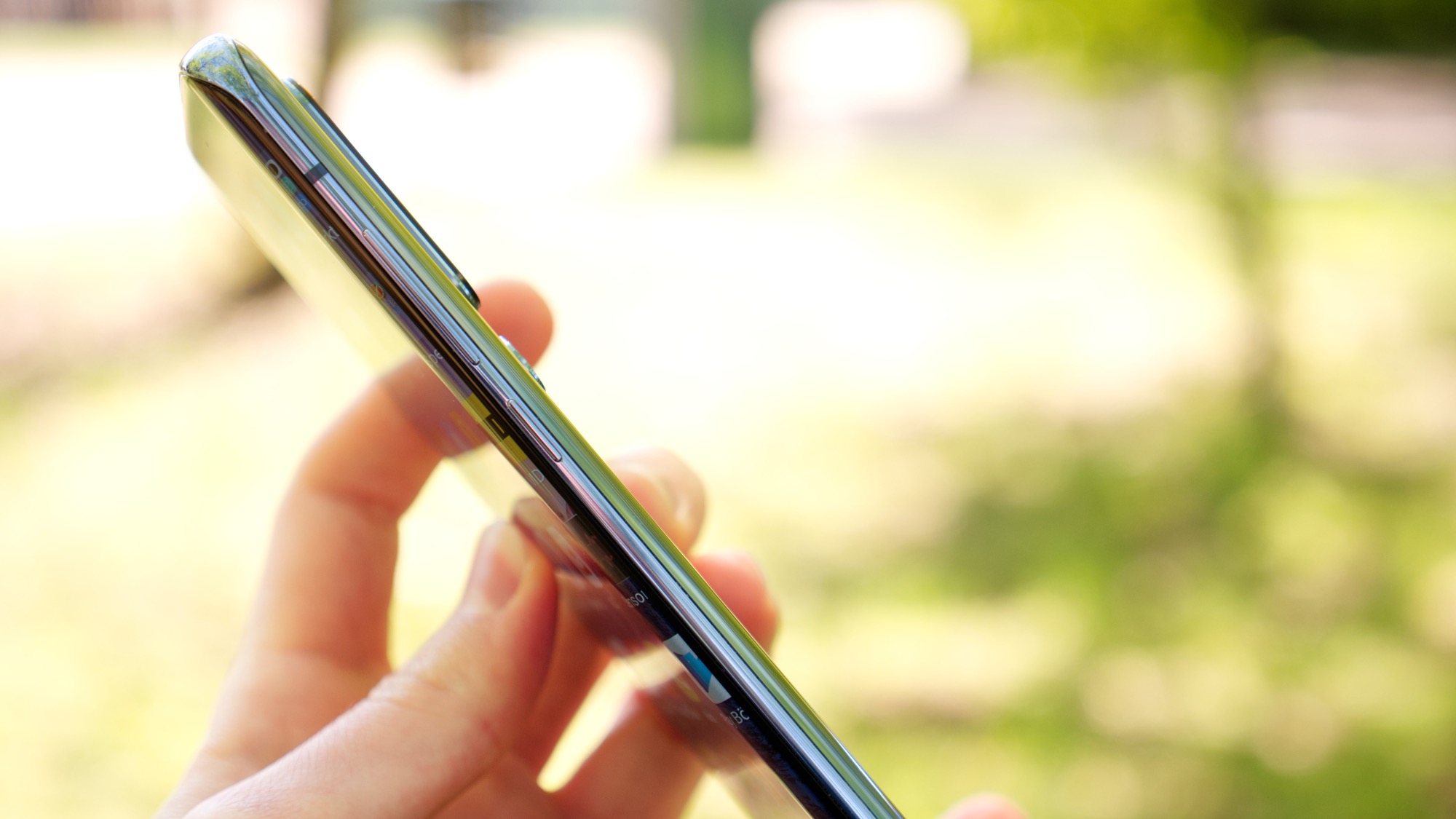 Glaset på baksidan möter metall längs sidorna. Det ger den en stadig konstruktion som vi är vana vid från dyra flaggskepp. Längs höger sida finns en på/av-knapp och två volymknappar, som tyvärr ger ganska dålig fysisk återkoppling. De fungerar bra men hade mått bra av att ge lite bättre feedback för att vara lättare att använda.