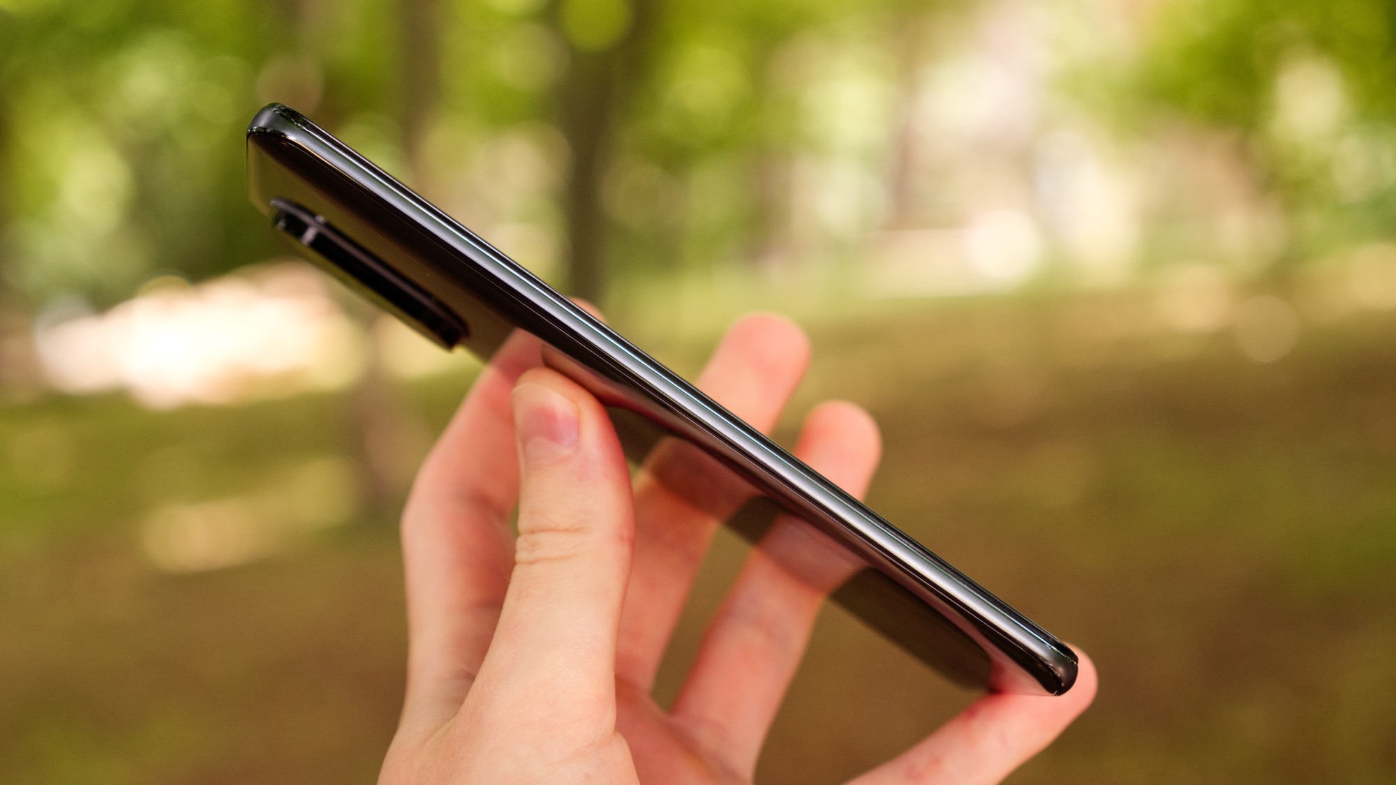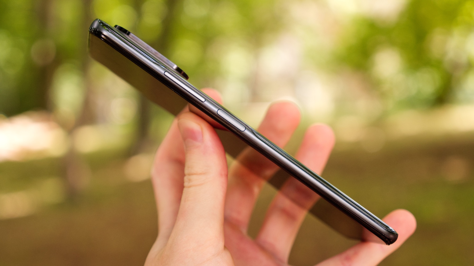 Mi 11i sparar inte på konstruktionen. Telefonen känns stadig och lyxig i handen med sin glasbaksida men också tack vare en metallram. Längs telefonens högra sida sitter en på/av-knapp som också fungerar som fingeravtrycksläsare. Knappen är bred men sticker inte ut mycket från telefonen och kan därför vara svår att känna sig fram till. Läsaren på knappen är alltid aktiv, vilket betyder att telefonen kan låsas upp utan att knappen trycks in. Tack vare en lång inläsningsprocess, är den mycket pålitlig och snabb. Den praktiska placeringen och pålitliga prestandan gör att vi faktiskt föredrar den enklare och billigare läsaren på Mi 11i, än den skärminbyggda i Mi 11. Ovanför knappen finns två volymknappar som ger helt okej fysisk återkoppling.