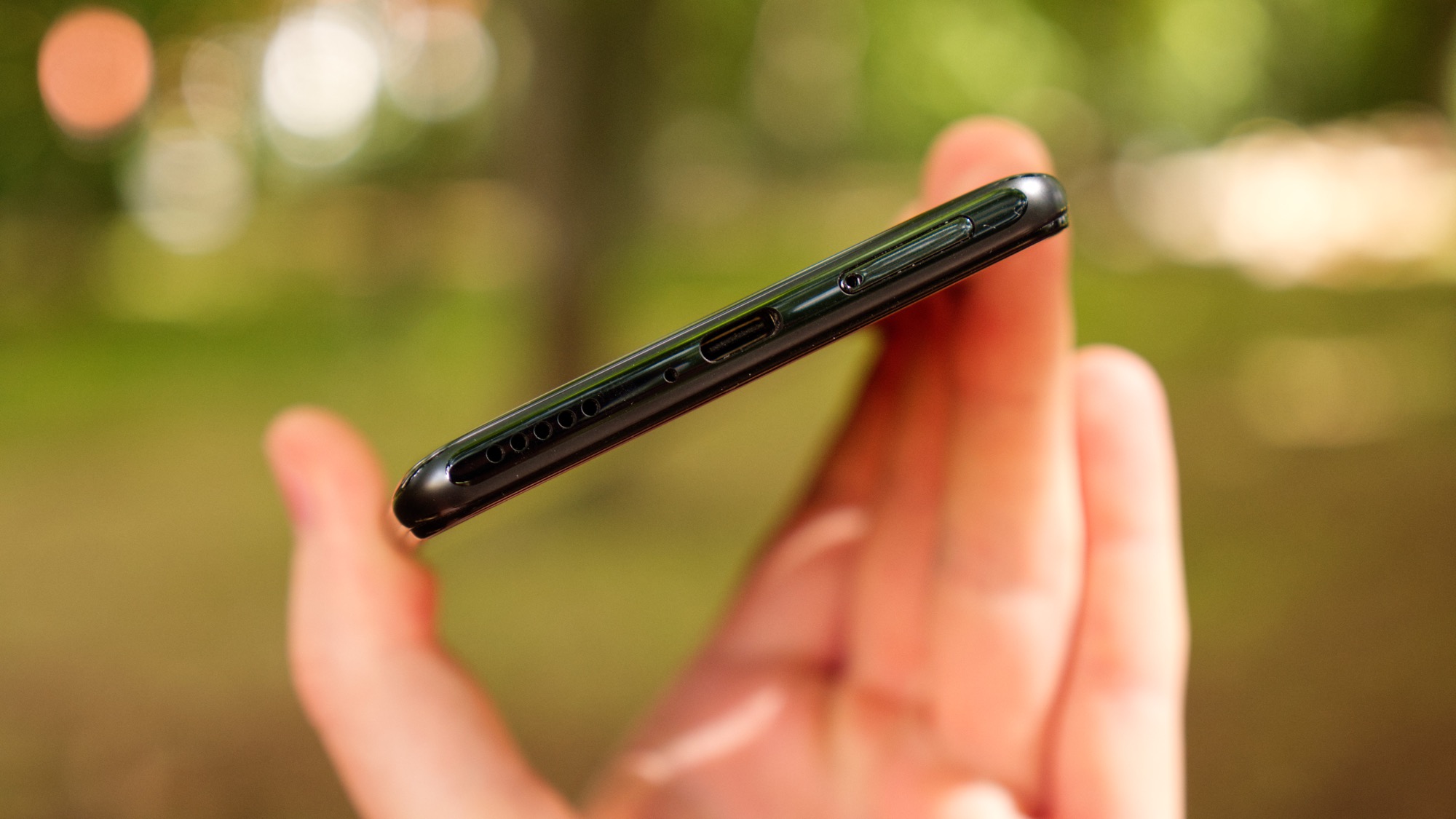 Undersidan bjuder på en kortläsare med plats för dubbla nanoSIM-kort. Här finns ingen microSD-kortplats. Mi 11i har inte heller stöd för eSIM. Den har i alla fall en USB C-port, även om den är begränsad till USB 2. Undersidan har också en högtalare och en mikrofon. Det finns alltså ingen hörlursport men Xiaomi inkluderar en adapter i lådan.