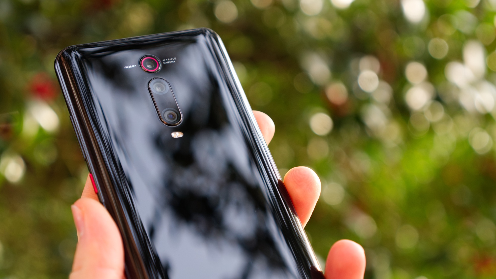 Baksidan av Mi 9T Pro är täckt av glas med rundade sidor och en enfärgad bakgrundsfärg som långsamt går över till ett randigt, nästan kolfiberliknande mönster längs kanterna. Effekten är främst synlig på nära håll och i bra belysning. Det ger den ett utseende med karaktär, utan att sticka i ögonen allt för mycket. På baksidan finns tre kameror med en tydlig röd ring runt huvudkameran. Ringen ger också lite karaktär till en design som annars hade riskerat att kännas lite anonym.