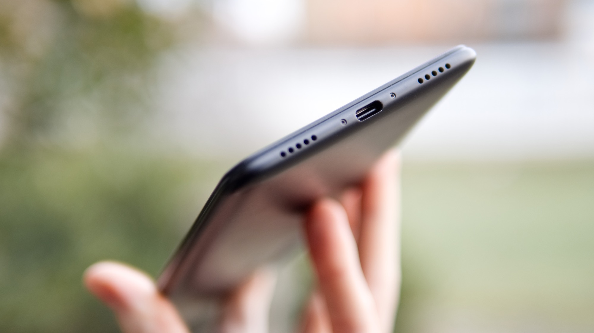 Längs vänster sida finns en korthållare med plats för ett nanoSIM- och ett microSD-kort eller två nanoSIM-kort. På undersidan finns slutligen en USB Typ-C-port, mikrofon och högtalare.