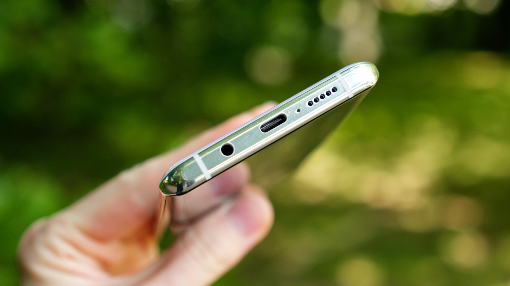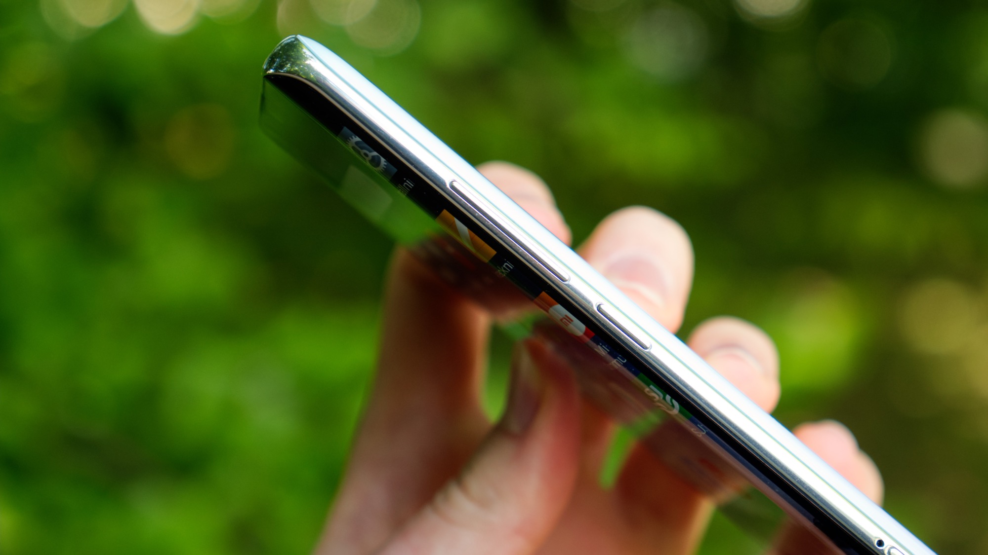 Framsidan bjuder på en stor skärm med tunna ramar. Glaset och skärmen böjer sig ner mot sidorna, vilket kan störa vissa användare som kan råka komma åt skärmen med handflatan. I toppen av skärmen sitter en kamera och ett par sensorer. Kameran har en droppformad flärp för att få plats. Ovanför kameran finns också en hörlur, som bara fungerar som en hörlur, trots trenden mot högtalare i hörlurar.