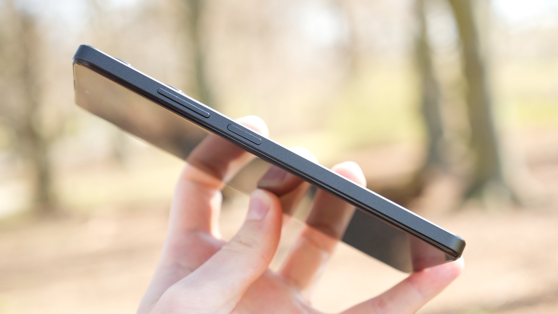 Sidorna av telefonen är gjorda av plast. Den känns ändå stadig. På ovansidan finns en IR-sändare för att styra stereo-apparater och liknande, en högtalare samt en hörlursport. Hörlursporten är en ovanlig funktion, även för billigare smartphones, nu för tiden. Längs höger sida finns en av/på-knapp som även fungerar som en snabb och smidig fingeravtrycksläsare. Vi tycker till och med att den är enklare att använda än dyrare läsare som sitter under skärmen i vissa andra smartphones. En nackdel med knappen är att den ger ganska dålig feedback när den trycks in.