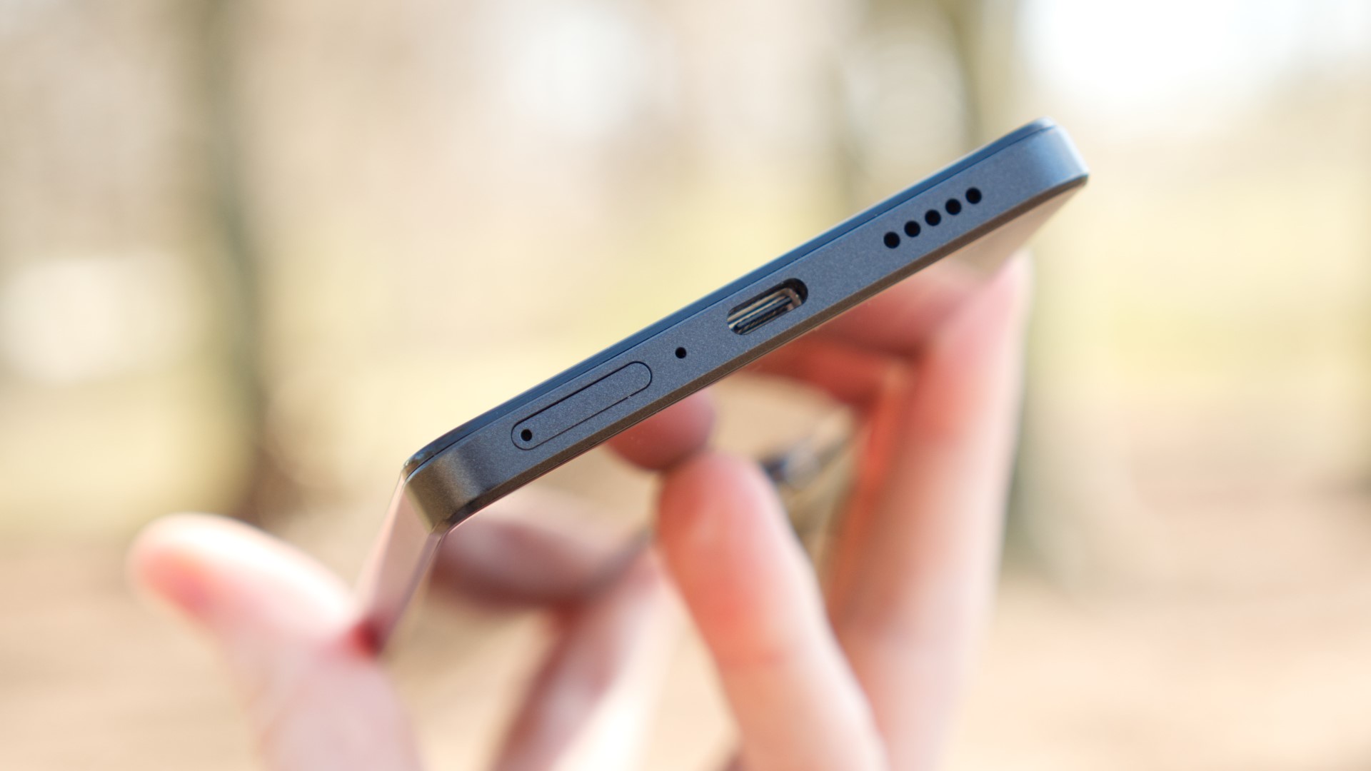 Längs undersidan finns en USB C 2.0-port, en mikrofon, en högtalare och en kortläsare med plats för dubbla nanoSIM men inget microSD-kort. Det saknas också stöd för eSIM, vilket är fullt rimligt i klassen.