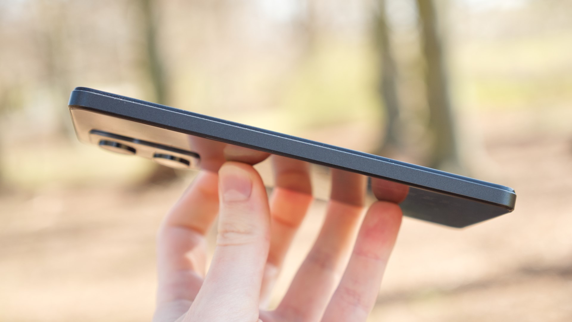 På framsidan finns en stor skärm med relativt tunna skärmramar och ett hål längs ovankanten för selfiekameran. Skärmen har en alltid-på-funktion som gör det enkelt att hålla koll på klockan och inkomna notiser. Med tunna skärmramar har telefonen helt rimliga yttermått med tanke på sin skärmstorlek. Telefonen känns också bra i handen. Den är väl konstruerad för sitt pris och även om den inte är vattentät, är den skyddad mot vattenstänk tack vare IP53-certifiering.