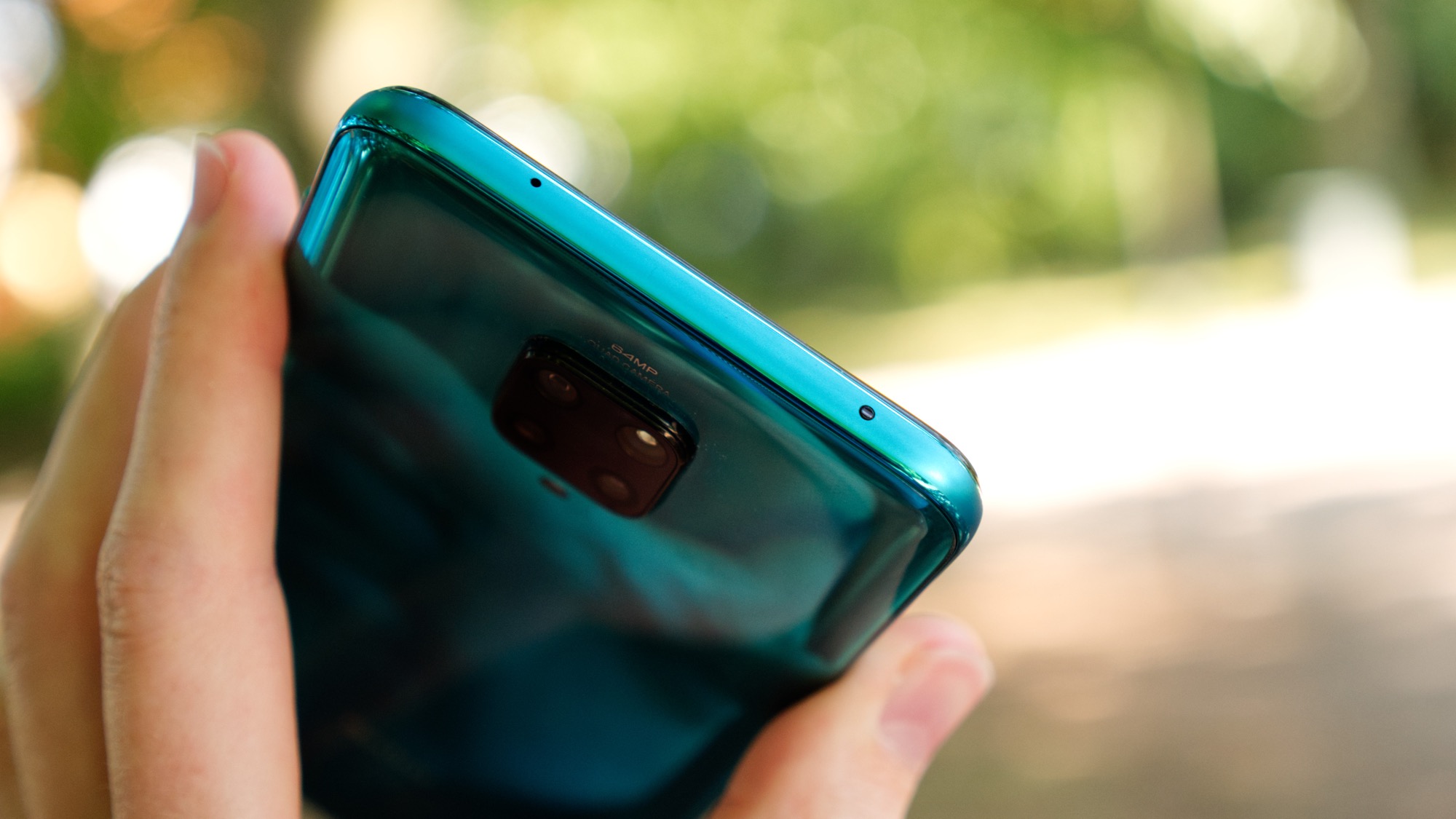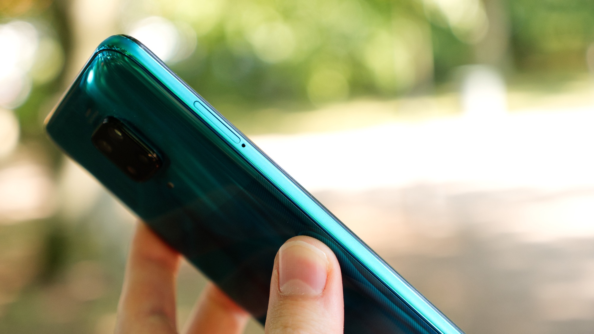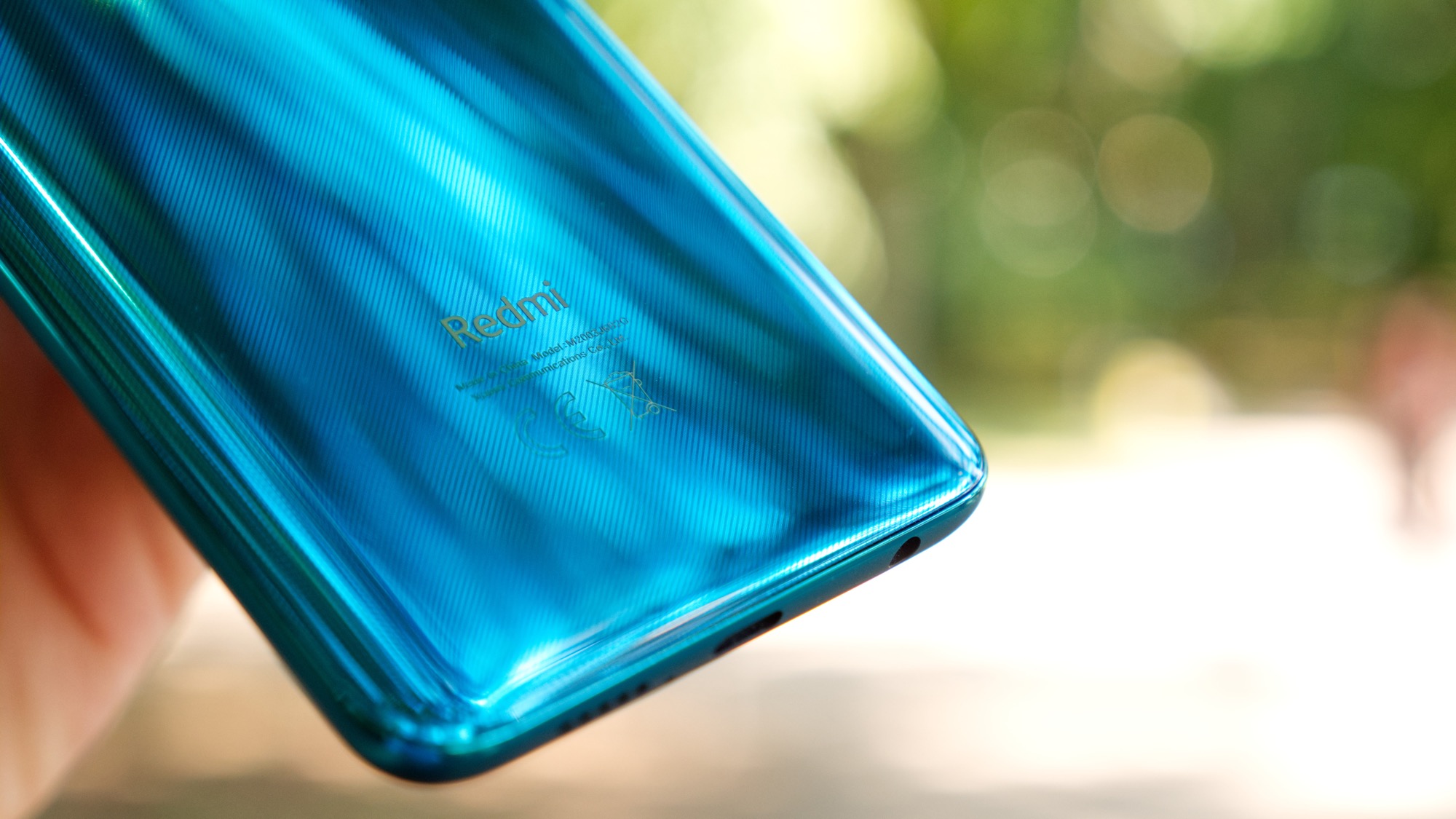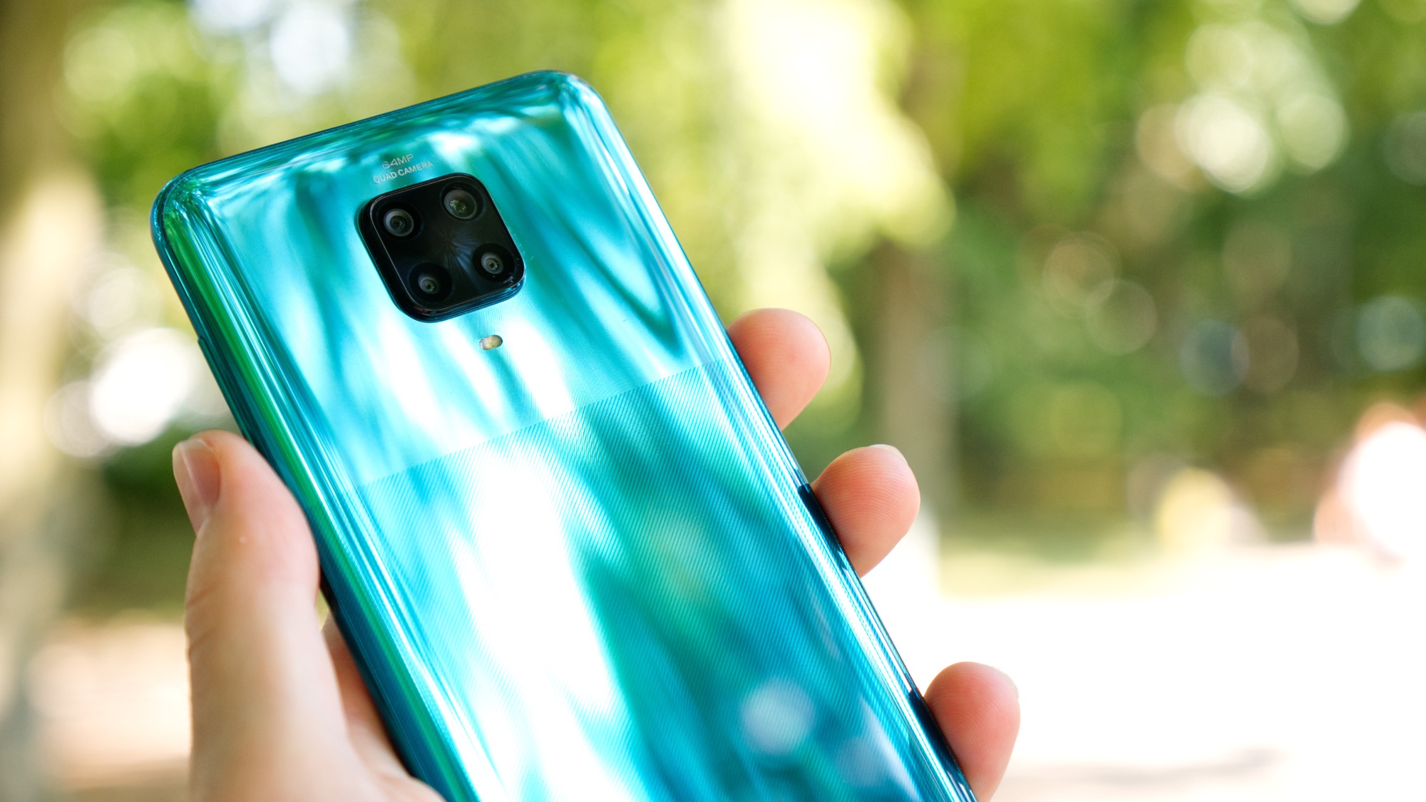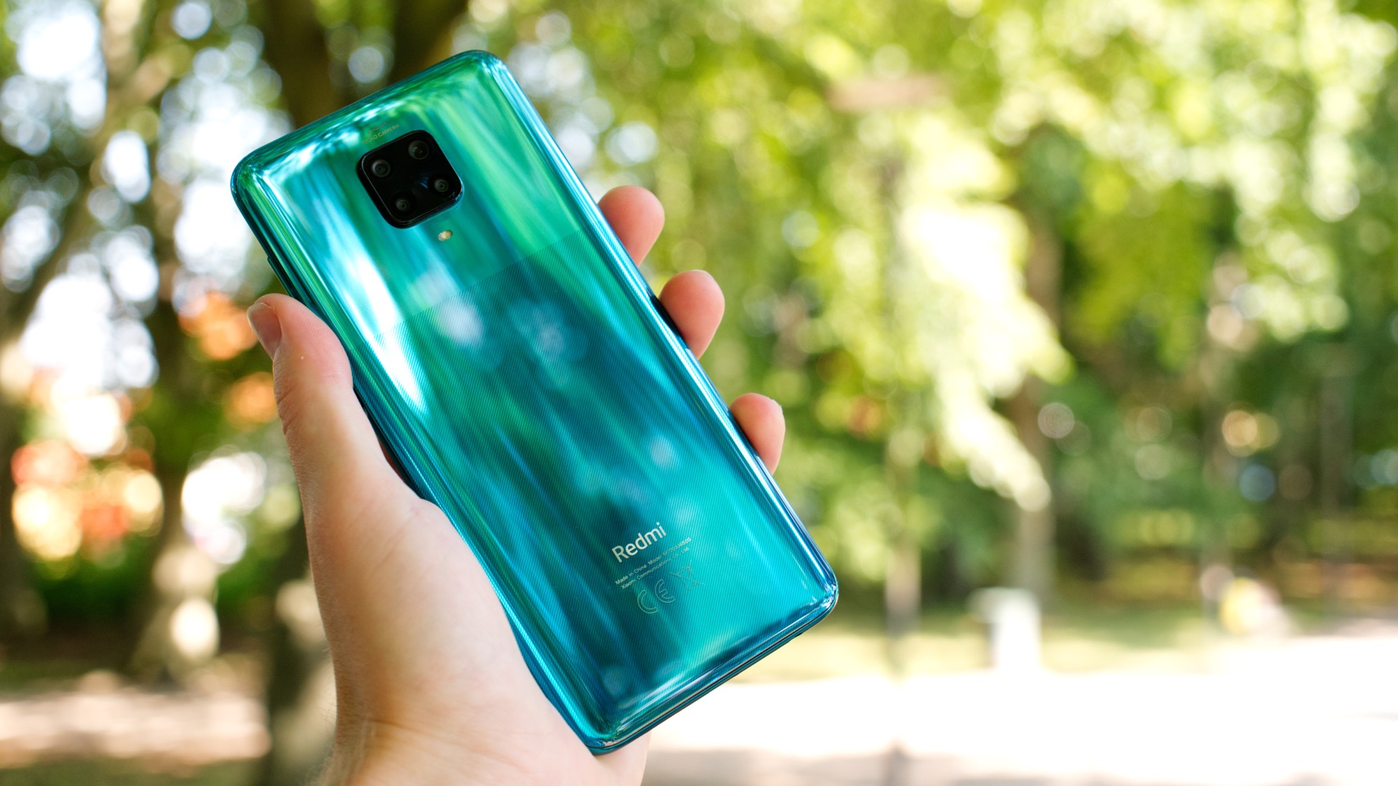 Baksidan av Redmi Note 9 Pro är gjord av glas. Det är ett allt mer ovanligt materialval i prisklassen, då de flesta väljer billigare plast. Det ger en stadig känsla i handen men gör också baksidan lättare att spräcka. Xiaomi inkluderar därför ett transparent plastskal i lådan med mobilen. Vårt turkosa testexemplar har ett randigt mönster som övergår till en mer spegelliknande finish vid toppen av baksidan. Här finns en kameramodul som sticker runt två millimeter från baksidan. Det är ganska mycket. Modulens centrala position gör i alla fall inte att telefonen är särskilt ostadig på ett platt bord. I modulen finns totalt fyra kameror och under den sitter en enkel LED-lampa.