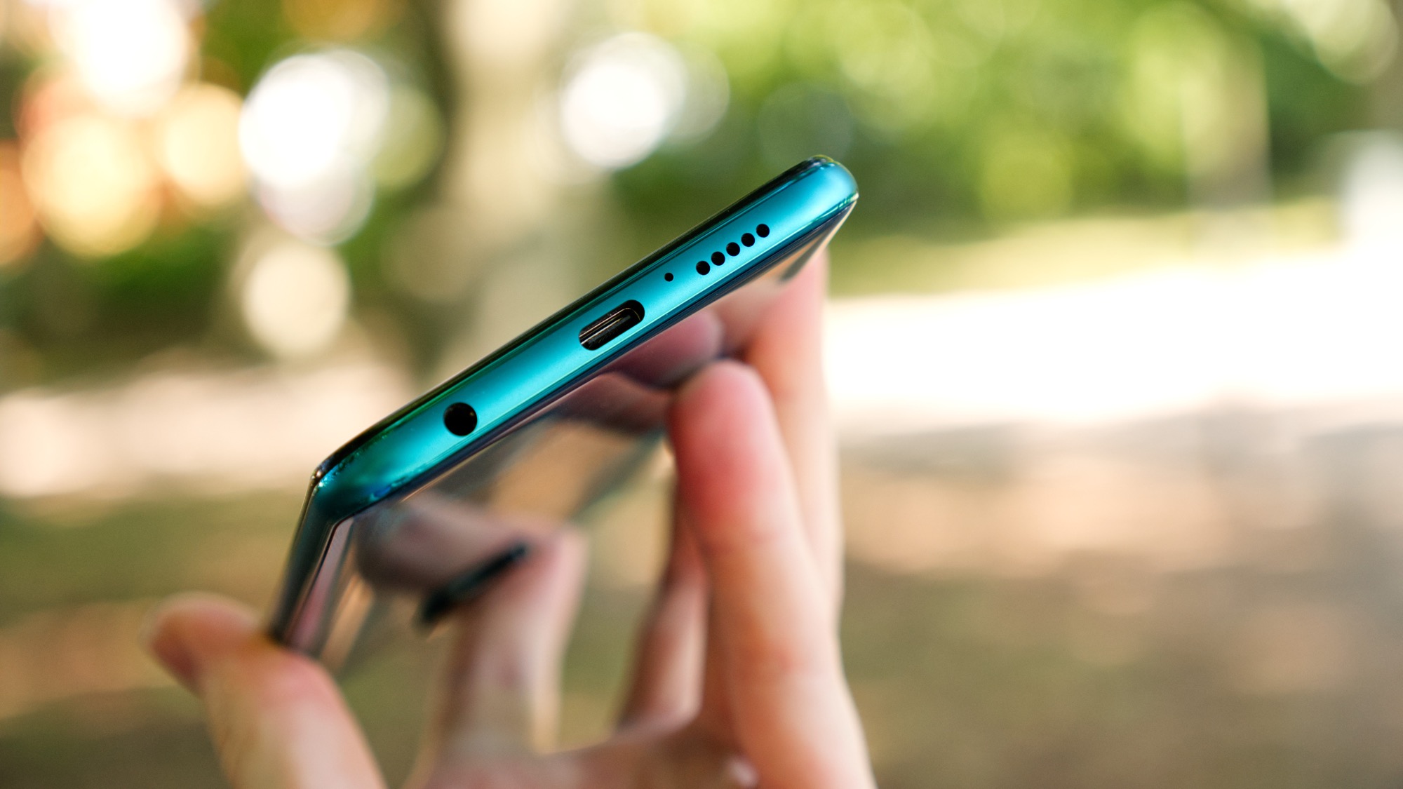 Undersidan har en USB Typ C-port, en hörlursport, en mikrofon och en högtalare. Här finns alltså gott om funktionalitet. De många öppningarna och det låga priset ger dock ingen vattentålighet.