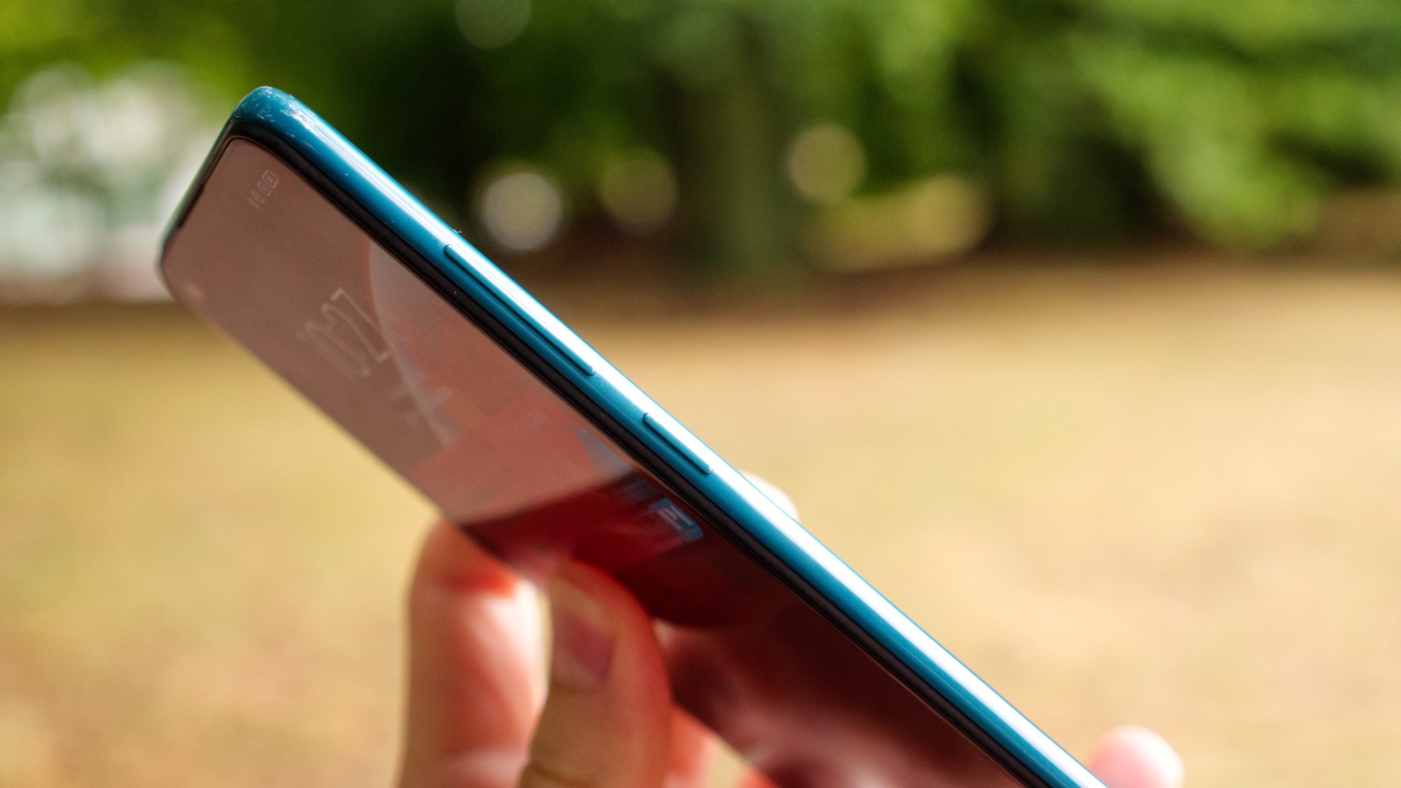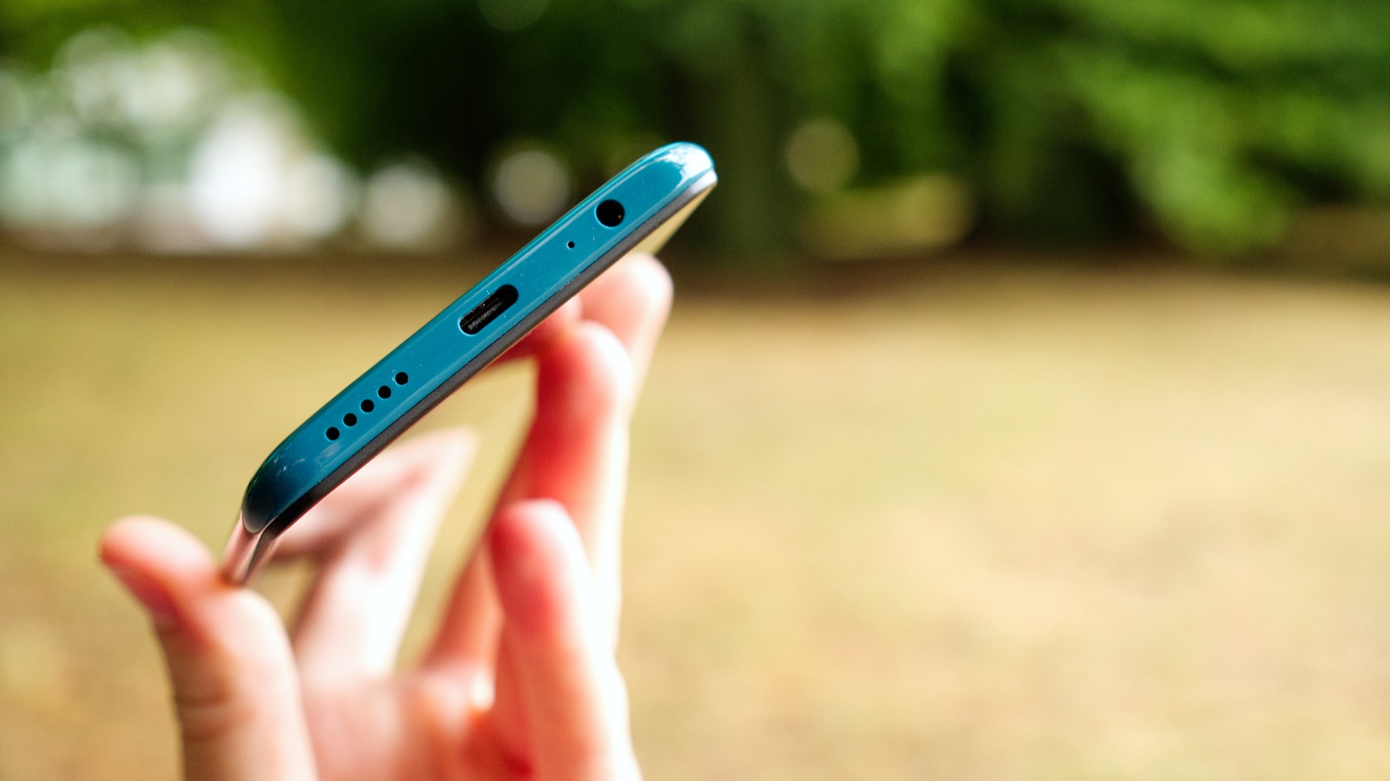 Baksidan är gjord av plast. Den ser möjligen ut som glas men är snarare en bra imitation. Vårt gröna exemplar skapar en drömsk reflektion som gör den lite roligare än vad en helt blank baksida hade varit. Baksidan är rundad längs sidorna för att ligga bekvämt i handen. Sidorna möter baksidan sömlöst och har en mörkt tukos färg på vårt exemplar. Längs höger sida finns en på/av-knapp och två volymknappar. Ovansidan bjuder på en IR-sändare och en sekundär mikrofon. Längs vänster sida finns en kortläsare med plats för dubbla nanoISM-kort eller ett nanoSIM- och ett microSD-kort. Undersidan bjuder slutligen på en högtalare, en mikrofon, en USB Typ C-port och en hörlursport.