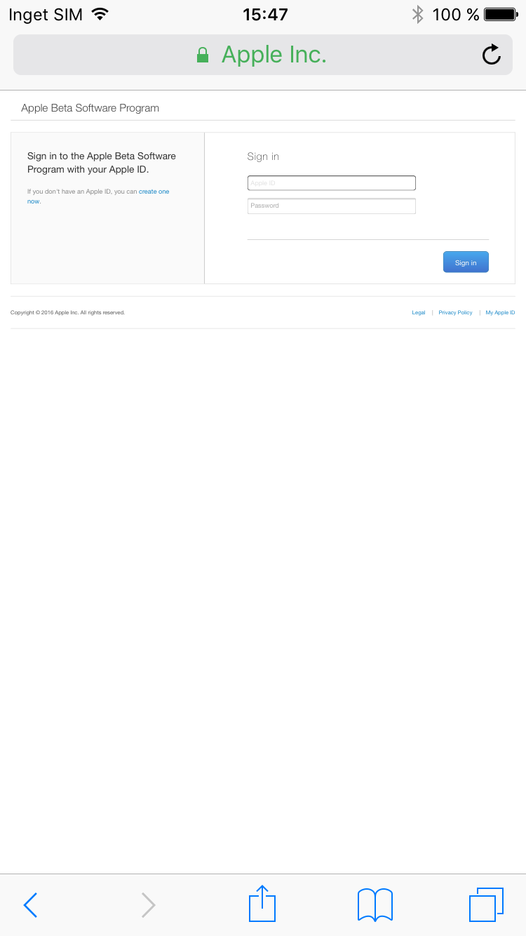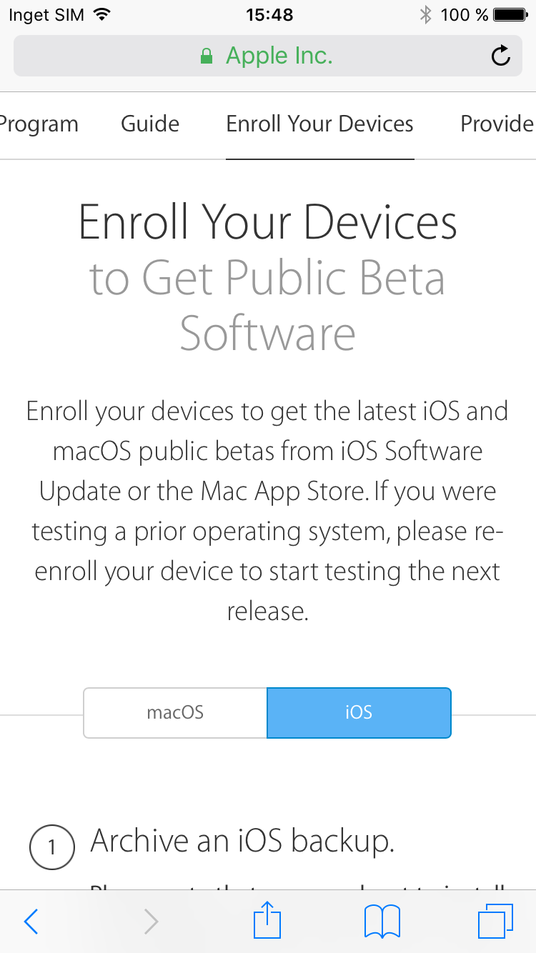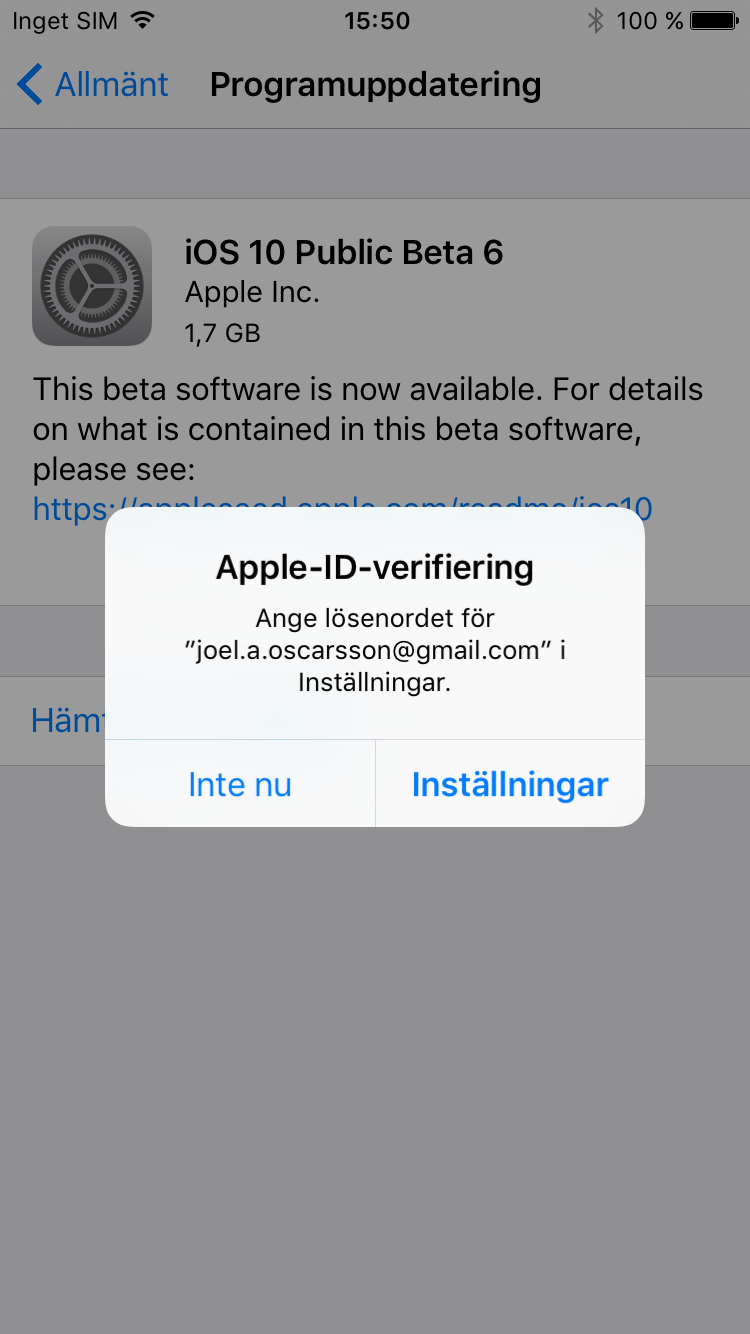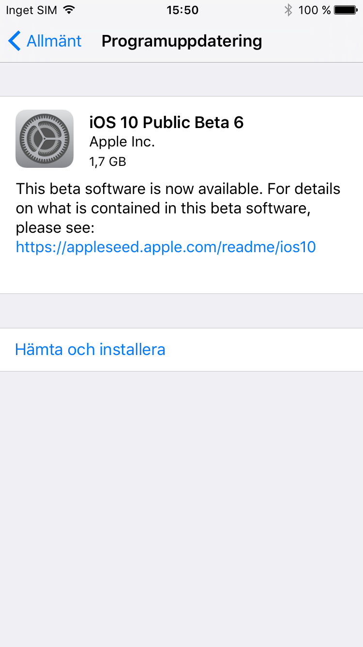 För att börja testa iOS 10 behöver du först gå med i Apples Beta Software Program. För att göra det går du till beta.apple.com eller söker efter Apple Beta Software Program på Google. Klicka på ”Sign up” om du inte gått med i programmet sedan tidigare. Logga in med ditt Apple-konto och välj sedan ”Enroll your devices” längst upp på sidan. Klicka därefter på ”Download profile”. Installera den profil som dyker upp på skärmen, acceptera villkoren och starta om telefonen. Gå därefter till Inställningar –> Allmänt –> Programuppdatering. Här finns nu en uppdatering till iOS 10 Public Beta 6. Den är 1,7 GB stor och kan därför ta en stund men den kan hämtas i bakgrunden så du kan fortsätta använda din telefon så länge.