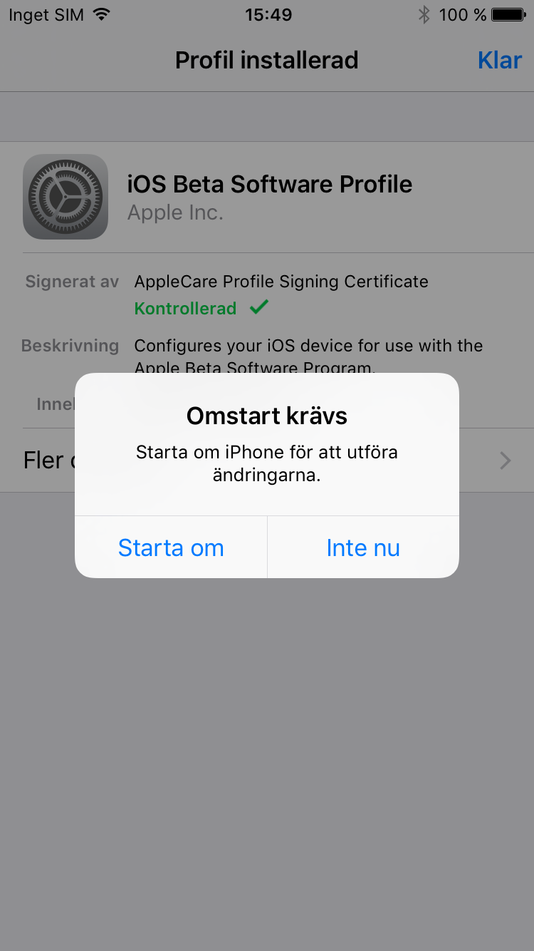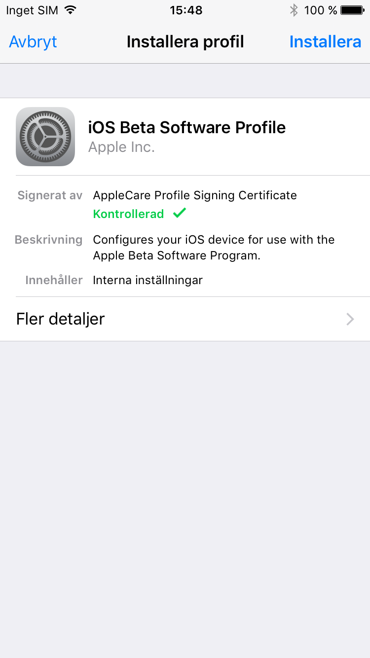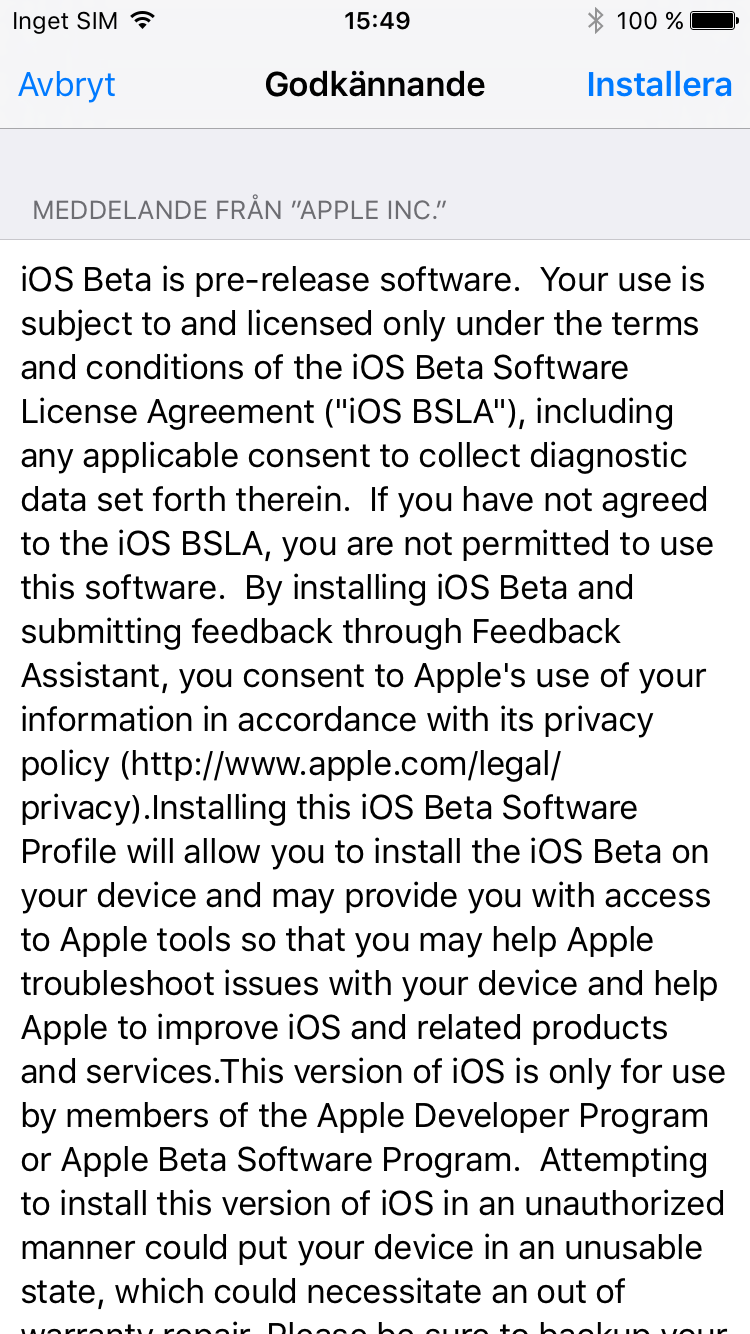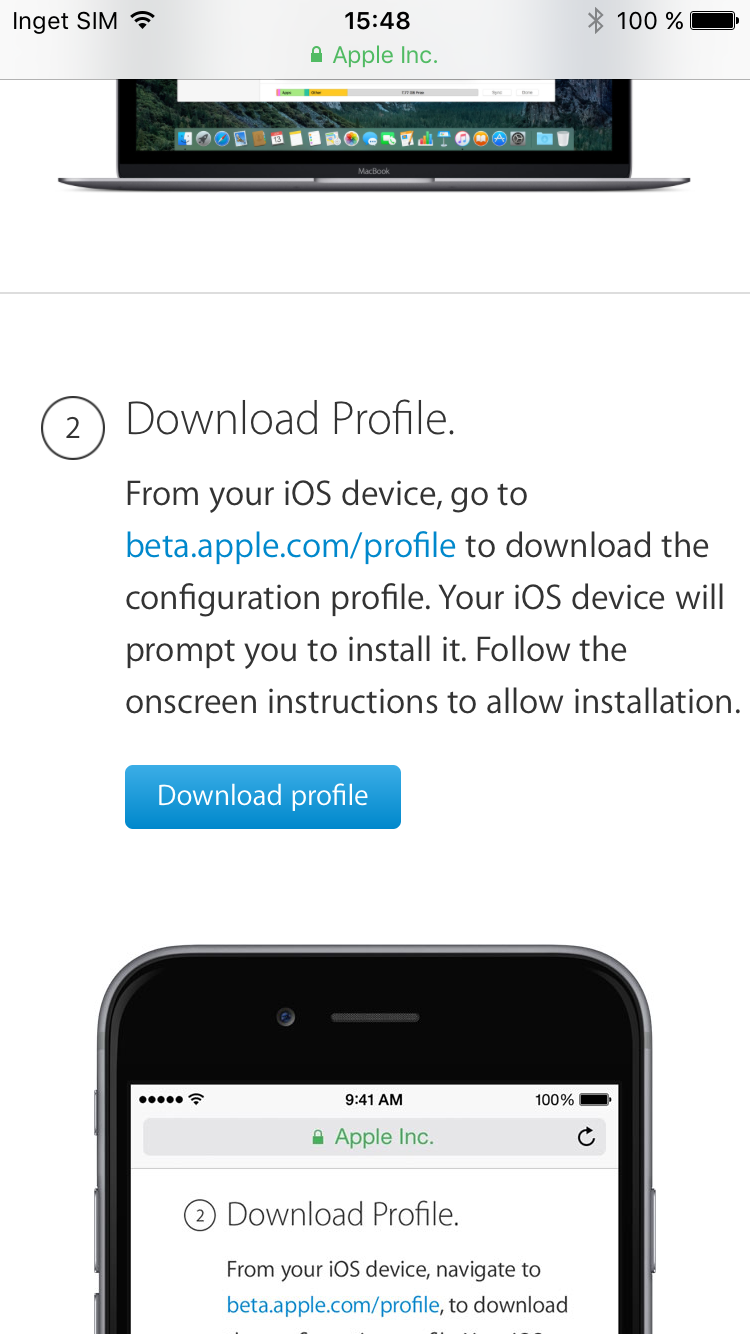 För att börja testa iOS 10 behöver du först gå med i Apples Beta Software Program. För att göra det går du till beta.apple.com eller söker efter Apple Beta Software Program på Google. Klicka på ”Sign up” om du inte gått med i programmet sedan tidigare. Logga in med ditt Apple-konto och välj sedan ”Enroll your devices” längst upp på sidan. Klicka därefter på ”Download profile”. Installera den profil som dyker upp på skärmen, acceptera villkoren och starta om telefonen. Gå därefter till Inställningar –> Allmänt –> Programuppdatering. Här finns nu en uppdatering till iOS 10 Public Beta 6. Den är 1,7 GB stor och kan därför ta en stund men den kan hämtas i bakgrunden så du kan fortsätta använda din telefon så länge.