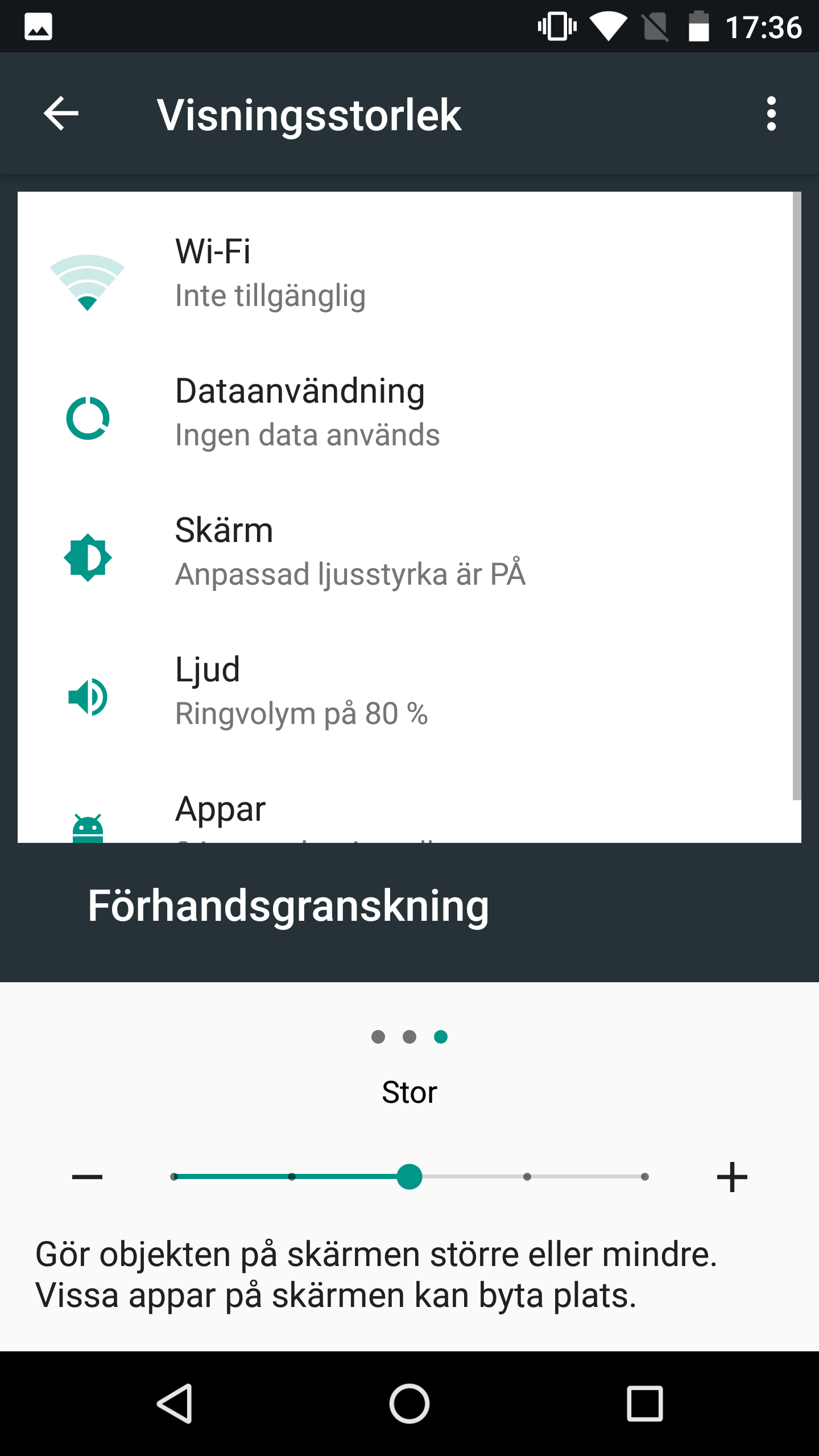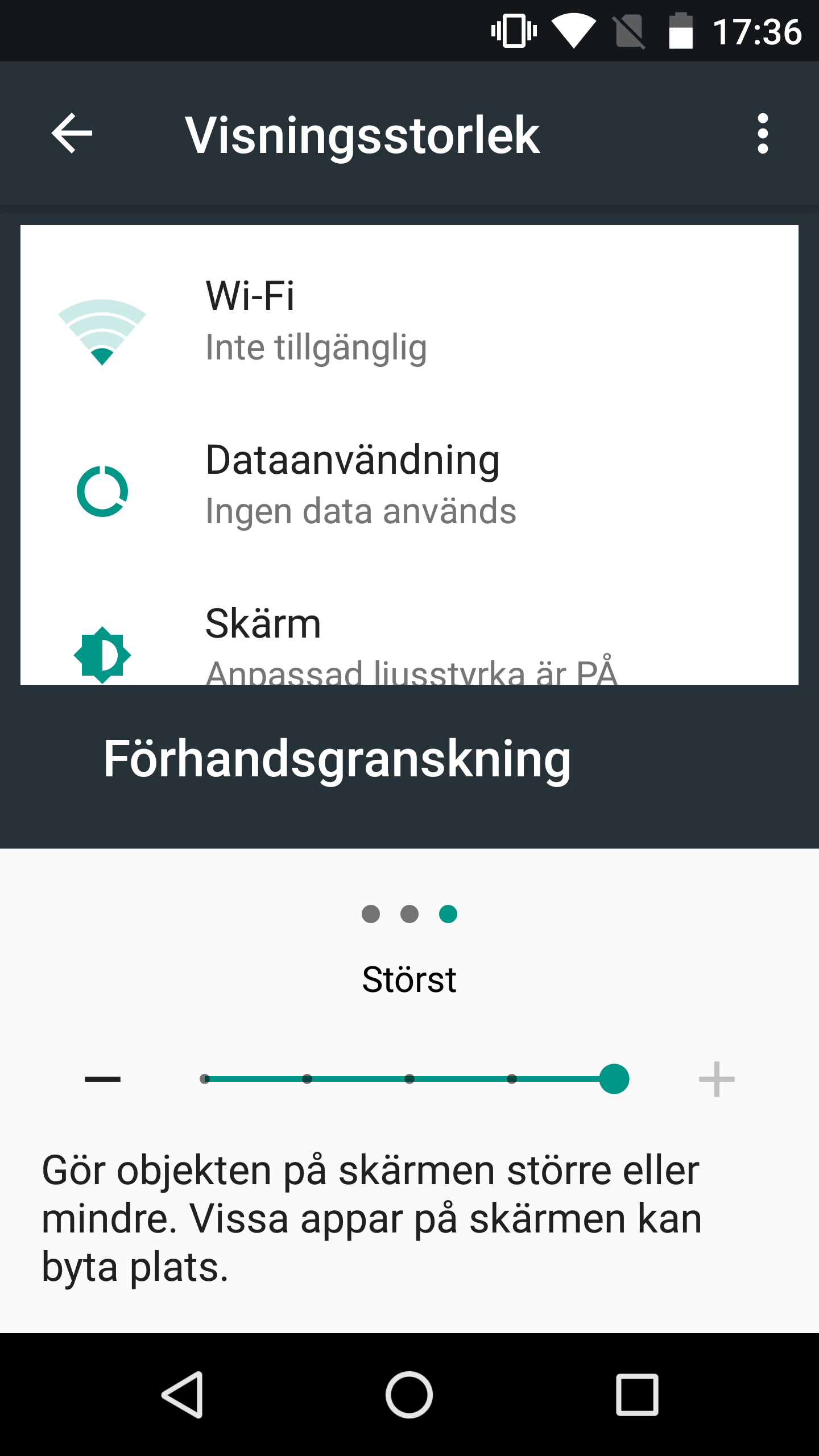 Inställningen av Visningsstorlek kan göras när som helst och är enkel att göra. Vissa tillverkare, så som Huawei, kräver dock att telefonen startas om innan ändringen kan genomföras.